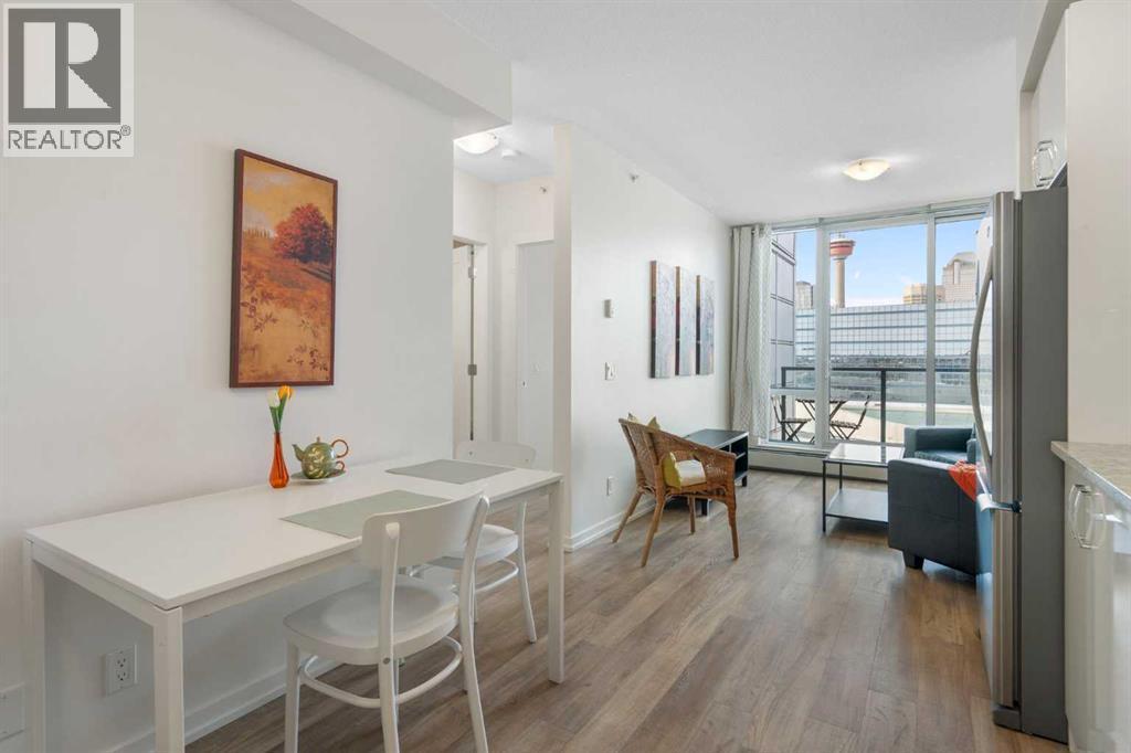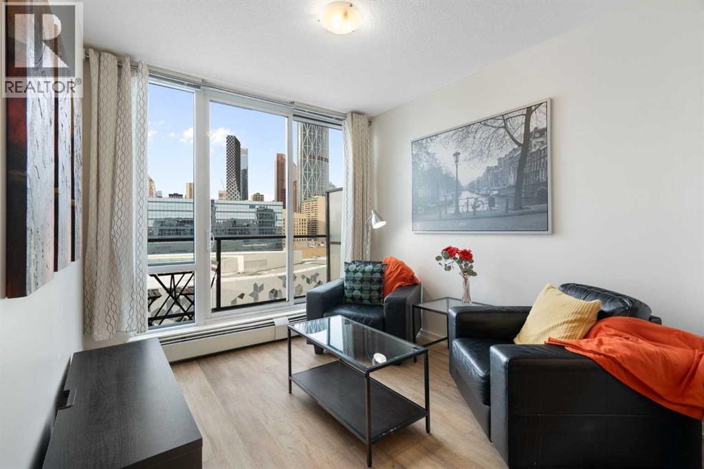 This immaculate, fully furnished property offers an exceptional downtown location and an effortless urban lifestyle. Complete with all kitchenware and a cruiser bike, it provides the ultimate convenience for walking or biking throughout downtown and along the river pathways. Just steps from City Hall LRT Station, Superstore, Central Library, Bow Valley College, Tim Hortons, Stampede Park, and a wide selection of shops and amenities, everything you need is truly at your doorstep.The secure, well-maintained, and professionally managed building presents beautifully. Inside, the bright and spacious one-bedroom unit features floor-to-ceiling windows in both the living room and bedroom, flooding the space with natural light and showcasing sweeping panoramic views. The open-concept layout seamlessly connects the kitchen and living area, complemented by durable vinyl plank flooring throughout. The modern kitchen is finished with high-gloss cabinetry, stainless steel appliances, quartz countertops, and a convenient built-in washer and dryer. The living room opens onto a generous west-facing balcony—an ideal spot to relax while enjoying stunning city and mountain views. A large primary bedroom and a well-appointed four-piece bathroom complete the home. Residents enjoy access to outstanding building amenities, including a fully equipped fitness centre, a rooftop patio with breathtaking city views, premium bike storage, a communal lounge, and an additional storage locker. Offered fully furnished as shown, this stylish turnkey condo is a fantastic opportunity for anyone seeking comfort, convenience, and the vibrancy of downtown living. For those interested parties that have a vehicle, there is a city lot right across the street that rents parking spots by the month. (id:6769