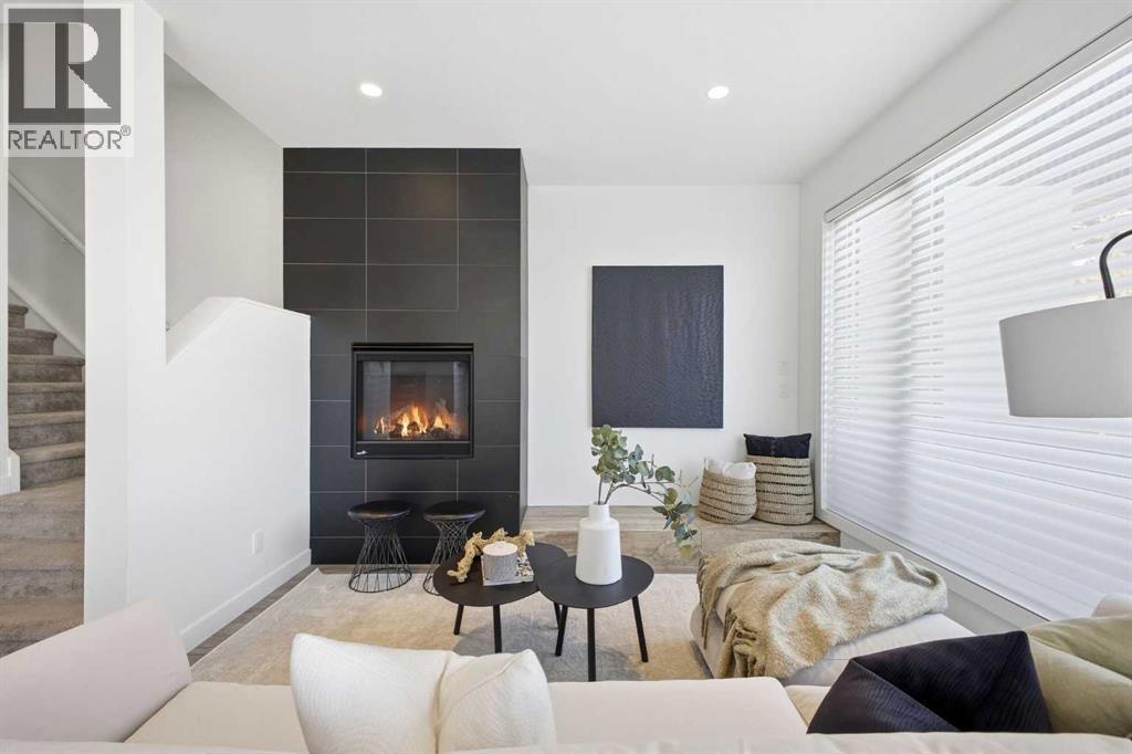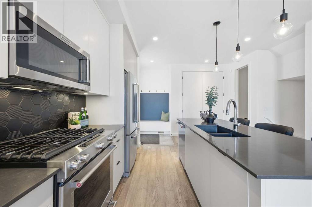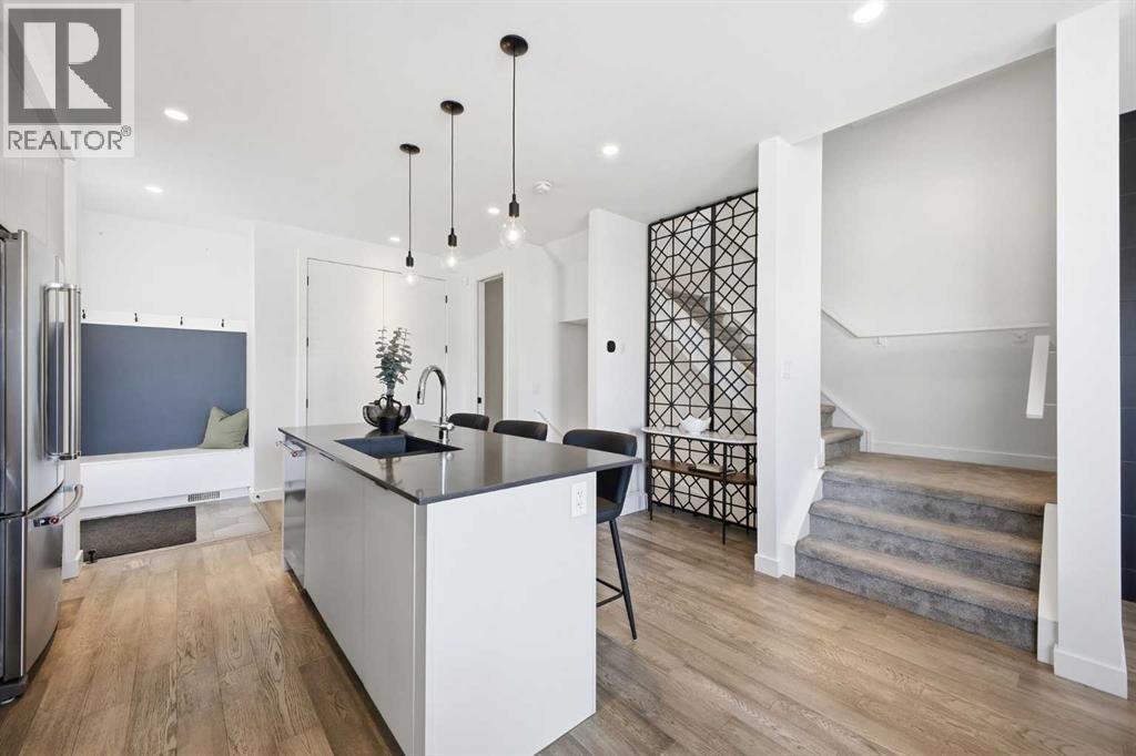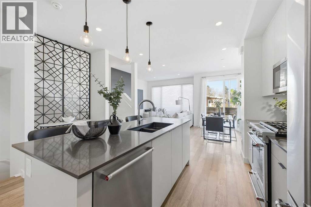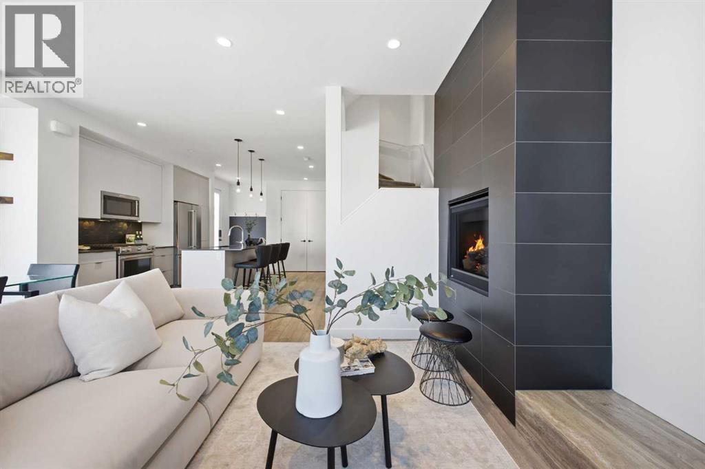Welcome to this beautifully designed three storey END UNIT townhome in the heart of Altadore, offering nearly 2,200 sq ft of refined living space enhanced by thoughtful upgrades and custom finishes throughout. The open and airy main level features a bright, contemporary layout anchored by a chef’s kitchen with quartz countertops, a large island with eating bar, abundant cabinetry, and stainless steel appliances. The adjoining dining area opens onto the deck—an ideal setting for hosting family and friends—while the inviting living room with gas fireplace creates a warm, stylish space for everyday living and entertaining. The second level hosts two generously sized bedrooms, a well-appointed 4 piece bath, and convenient laundry. The private primary retreat includes a walk in closet and a secluded 4 piece ensuite with dual sinks and an oversized shower. The third floor loft, complete with a wet bar, offers exceptional flexibility as a media room, home office, studio, or lounge. From here, step out onto the private rooftop patio and enjoy sweeping views—an impressive extension of your living space. The fully finished basement adds even more versatility with a spacious recreation room, a third bedroom, and a full bathroom—perfect for guests or additional family needs. Outside, a large front patio provides another inviting spot to relax or entertain. Additional highlights include central air conditioning for year round comfort, heated bathroom floors throughout, and the convenience of a single detached garage. Set within one of Calgary’s most desirable inner city communities, this home is steps from parks, schools, shopping, and the vibrant amenities of Marda Loop, with quick access to downtown. This Altadore townhome blends modern design, custom craftsmanship, and urban convenience—an exceptional opportunity in a sought after location. (id:6769