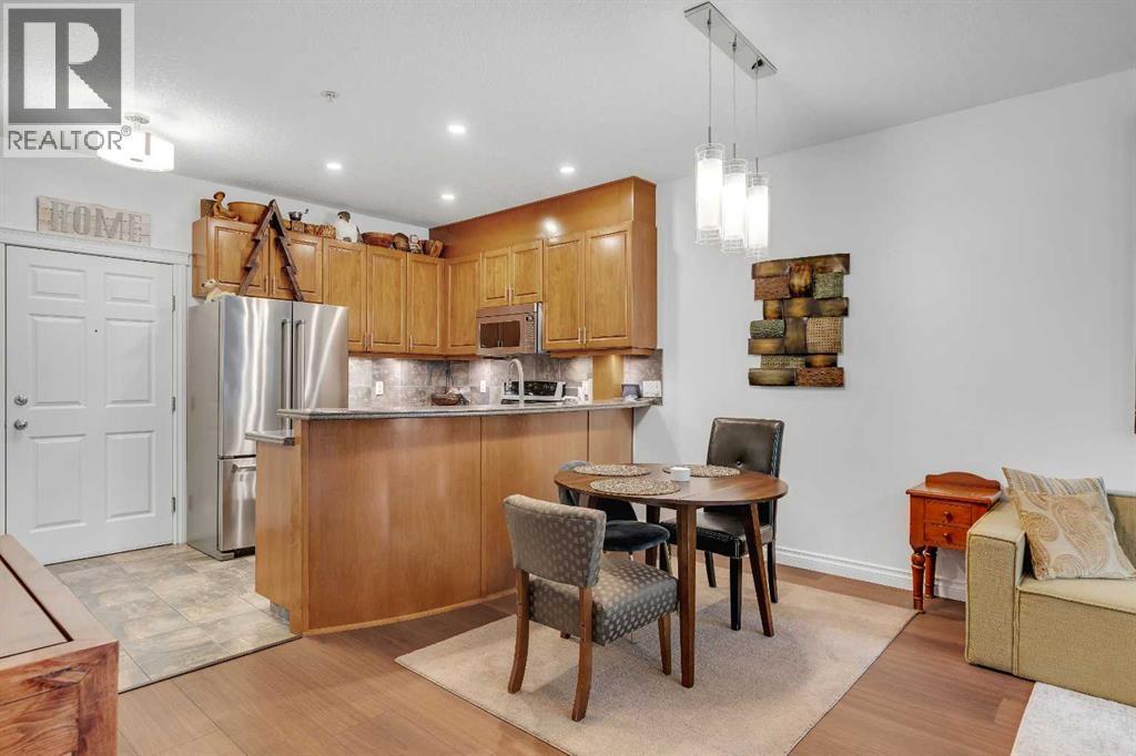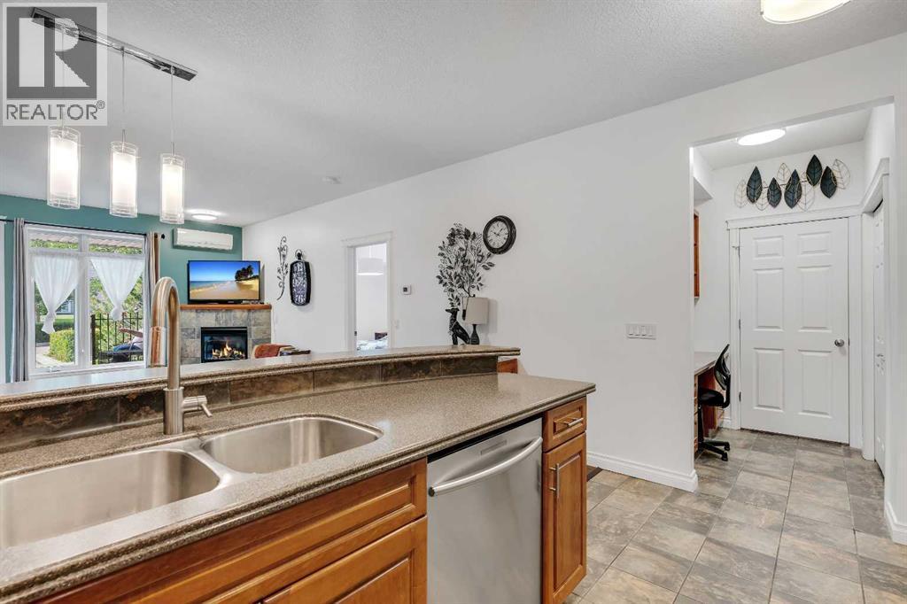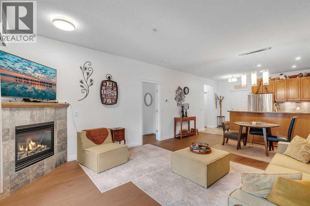 GROUND FLOOR WITH PRIVATE FRONT ACCESS | RENOVATED INTERIOR | TITLED UNDERGROUND PARKING | A/C | FLOODED WITH NATURAL LIGHT | LARGE SOUTH FACING WINDOWS | Welcome to Unit #101 at Copperwood in Spruce Cliff, ideally located just steps to Edworthy Park, the Bow River pathway system, and Shaganappi Point Golf Course. This upgraded 1 bed + 1 bath condo offers over 750 sqft of open concept living with fresh paint, high end engineered hardwood flooring, upgraded lighting, and a refreshed bathroom. The large kitchen is outfitted with stainless steel appliances, Corian countertops, garburator, a generous breakfast bar, and plenty of cabinetry for both storage and display. The living area centres around a cozy gas fireplace and flows seamlessly to the spacious covered patio, perfect for morning coffee or direct street access for dog owners or those who prefer to avoid elevators. The primary bedroom features a walk in closet with built in organizers and a 4 piece en suite. Additionally there is a built in desk or work area at the front that is perfect for those working from home. Additional features include in suite laundry with extra storage, built in central A/C, a titled heated underground parking stall, an assigned storage locker, and access to Copperwood’s outstanding amenities including a massive fitness facility, guest suite, party room, car wash bay, and secure bike storage. Not to be overlooked, the parking, storage, and elevator are all within a few metres of each other, a convenience often missed in other condo developments. Pet friendly and perfectly suited for professionals, travellers, or downsizers looking for a Spruce Cliff condo in a vibrant inner city location, walkable to Westbrook C Train Station, Westbrook Mall, the public library, groceries, parks, pathways, and just 5 minutes to downtown Calgary. Please reach out to book your private showing today. (id:6769
