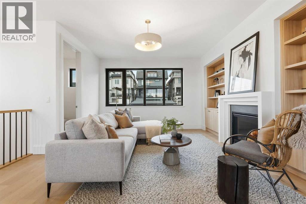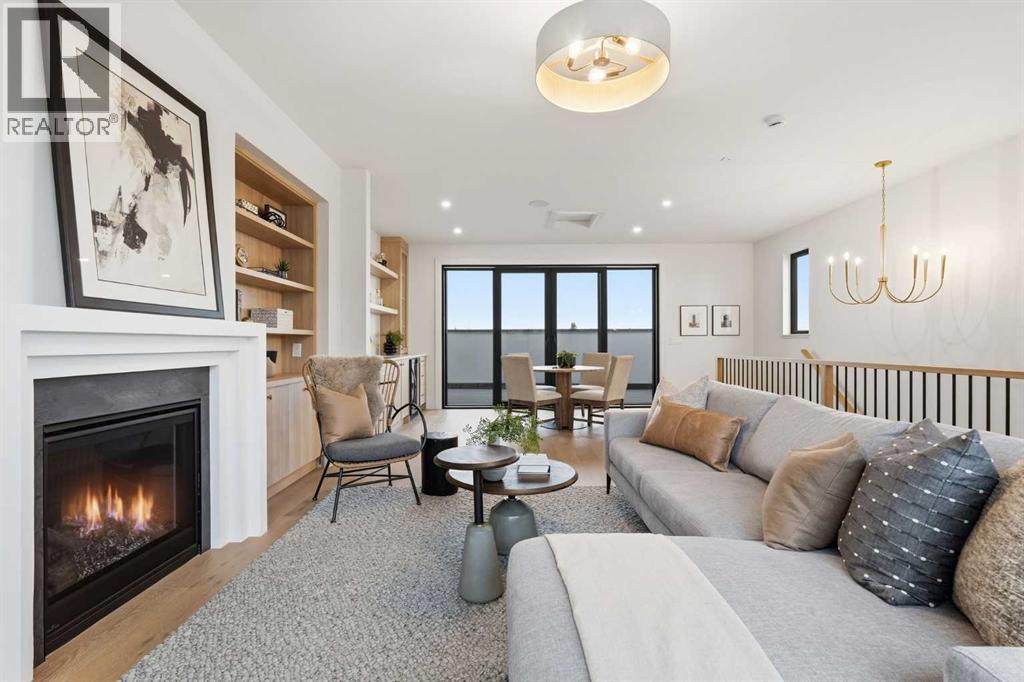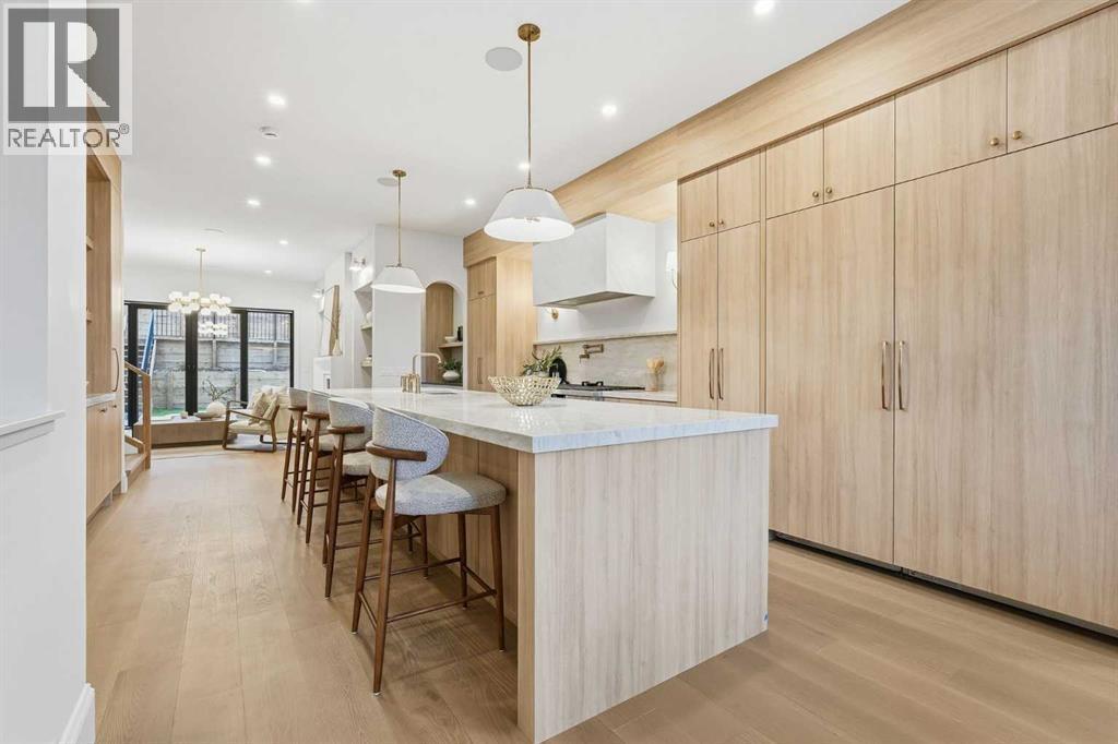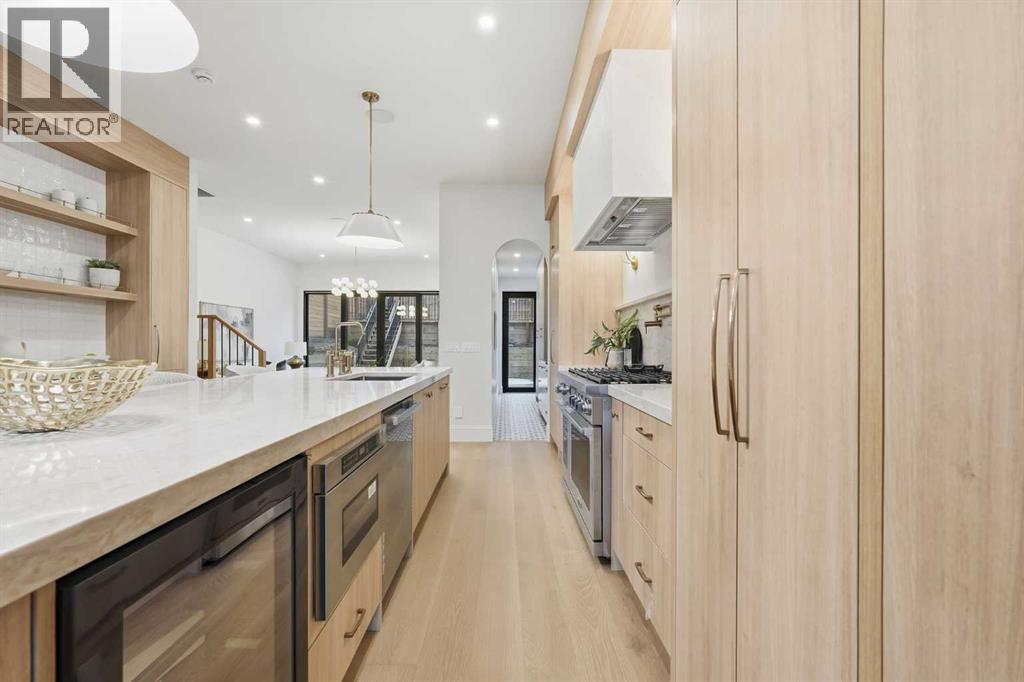 Experience quiet luxury at its finest in this stunning three-storey home, set on one of the highest points in Calgary with uninterrupted skyline views from all levels, and steps from Marda Loop. The exterior makes a striking first impression with its blend of classic white brick detailing, black accents, and timeless stucco. The curb appeal is enhanced by clean glass railings, low-maintenance landscaping, and a welcoming front balcony. Step into a beautiful and functional foyer, complete with custom built-in millwork, a bench, and smart storage including hanging compartments, open shelving, and pull-out drawers. The open-concept design includes a dedicated dining area surrounded by massive sliding doors that lead to the balcony. This is styled for intimate dinners, elevated entertaining, or just enjoying a coffee with stunning skyline views.At the heart of the home, the chef’s kitchen is a true masterpiece. It features a 14-foot island with quartz from Hanstone (made in Canada), a quartz backsplash, plaster textured hood fan, pot filler, and oversized premium appliances including a 48” dual oven gas range and a 66” built-in fridge/freezer. There is a butler’s pantry with sink and cabinetry, mud room, coffee bar, and tons of storage including under the island. The kitchen is set up to be not only beautiful but also functional and includes a garbage drawer, bar cooler, and spice racks/cabinetry. Across from it, the living room centers around a beautiful fireplace and custom built-ins which make it cozy, refined, and made for real living. Large doors lead to the deck and the sunny south facing backyard, that is tiered, turfed and truly low maintenance. Throughout the home, you’ll enjoy tons of natural sunlight from the large windows, 10-foot high ceilings, arched transitions, and wide-plank engineered hardwood create a warm and elevated flow.Upstairs, the primary suite is a serene retreat with a spa-like ensuite featuring a steam shower, dual vanity, custom tilew ork, and skyline views. Secondary bedrooms are generously sized, each with walk-in closets, and connected by a stylish bathroom ideal for kids or guests.The third level includes a beautiful rooftop patio where you can soak in the skyline views, a stylish bathroom with nice finishes, a rec/living area with built-in storage and a gas fireplace. There is a large wet bar with LED lighting in the cabinetry, beatiful tile, shelves and bar fridge. This is the ultimate entertaining area to host friends and family.The fully finished basement extends the living space with heated floors roughed-in, a large flex room or guest suite, and full bathroom. Additional features include a heated double attached garage with epoxy flooring, integrated speakers and security system, central A/C, roughed-in heated driveway.Whether you're enjoying a quiet morning in the sun, hosting friends on the rooftop, or watching the city light up at night, this home was built for a lifestyle that’s elevated and timeless. (id:6769