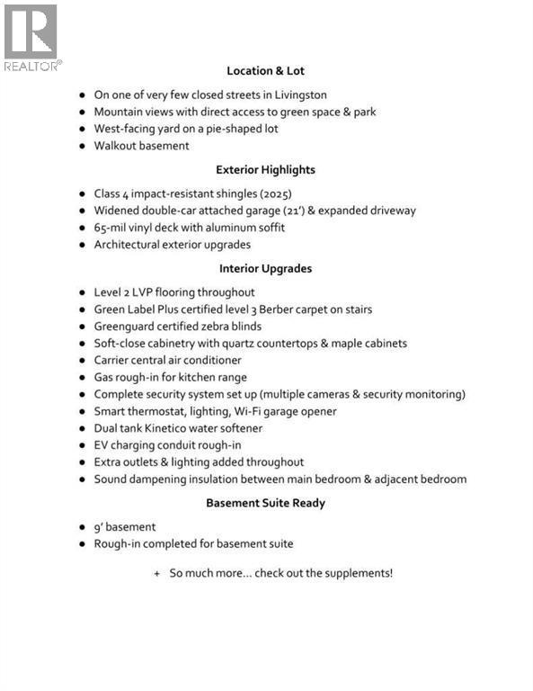 Rare opportunity to own a like-new walkout home on a massive west-facing pie lot backing onto green space, with mountain views on clear days! Built just over 2 years ago and located on one of Livingston’s few quiet closed streets with no through traffic, this property offers privacy, views, and a lot size that is nearly impossible to replicate in newer developments.Welcome to 150 Lucas Close NW, offering nearly 1,800 sq ft above grade, a double attached garage, and a thoughtfully designed layout built for modern living. The bright main floor features an open concept design with a stylish kitchen complete with quartz countertops, soft-close maple cabinetry, Whirlpool appliances, and gas range rough-in, flowing into the dining area and living room with large windows and access to the rear deck overlooking the expansive backyard.Upstairs you’ll find 3 bedrooms, a spacious primary retreat with a large walk-in closet and ensuite, upper floor laundry, another full bathroom, and a large bonus/family room—perfect for families or additional living space. The layout was carefully designed with no bedrooms above the garage and sound-dampening insulation between key rooms for added comfort.The walkout basement with 9’ ceilings is already roughed in for a future suite (subject to City approval), with drain rough-ins for kitchen, bathroom and laundry, a 200-amp electrical panel, gas connection, and separate door locks already installed—offering excellent potential for future development.Additional features include Class 4 impact resistant shingles, central air conditioning, smart home upgrades, hardwired security cameras, EV charging conduit rough-in, widened double attached garage, expanded driveway parking, and an oversized backyard.And all this before even mentioning the incredible amenities that make Livingston one of Calgary’s most exciting communities. Residents enjoy access to the impressive Livingston Hub, a 35,000 sq ft residents’ association facility featuring skating rinks, tennis courts, playgrounds, splash park, indoor gathering spaces and year-round community programming. The neighbourhood is designed around outdoor living with extensive pathways, parks, and green spaces, while still offering convenient access to Stoney Trail, Deerfoot Trail, nearby shopping, schools, and the Calgary International Airport.A move-in ready home on one of the best lots in Livingston, combining location, privacy, and future potential. (id:6769