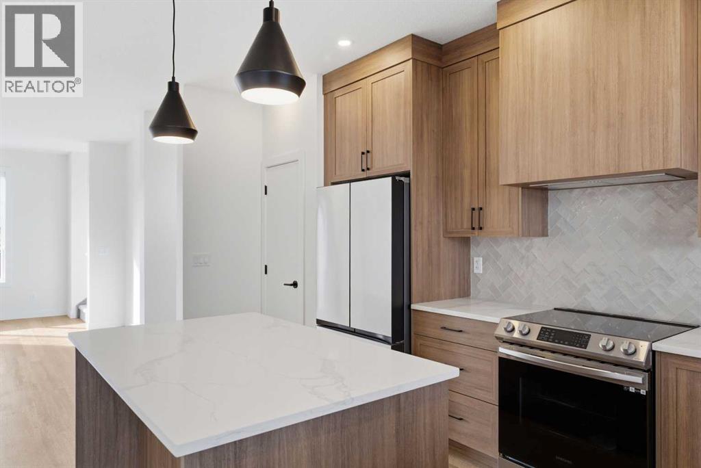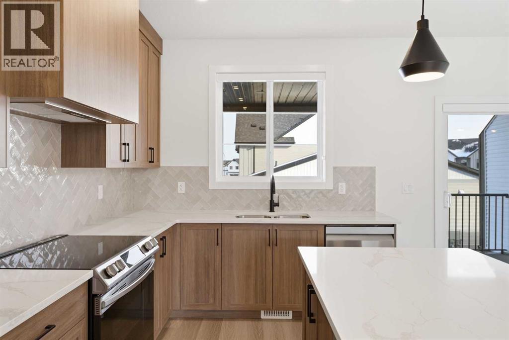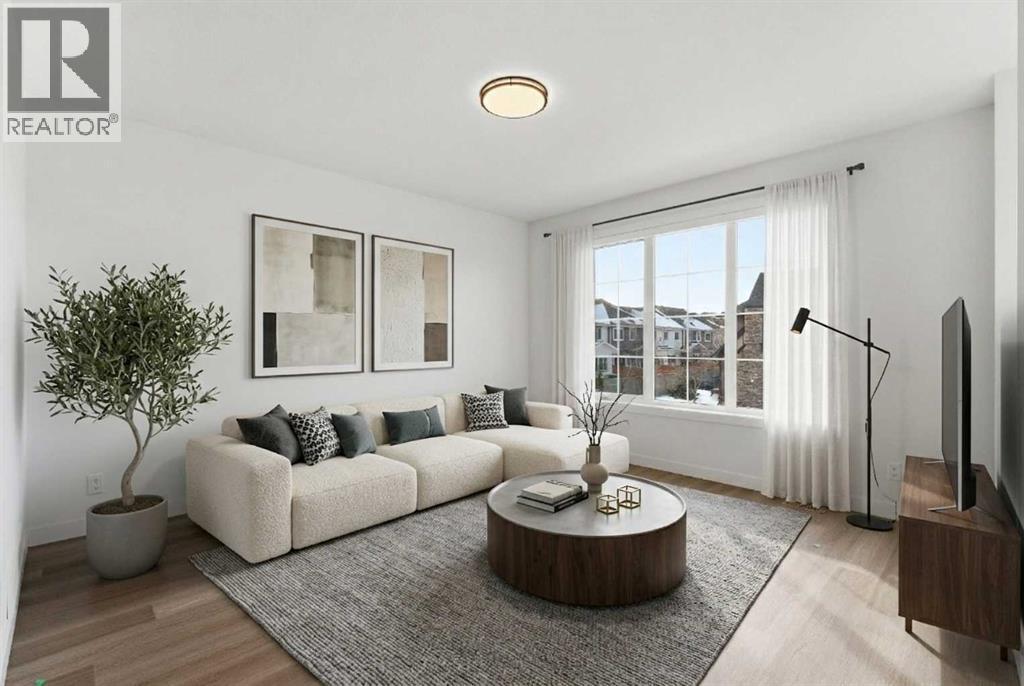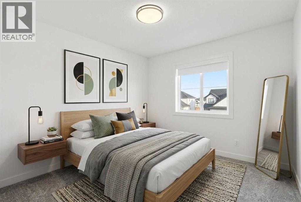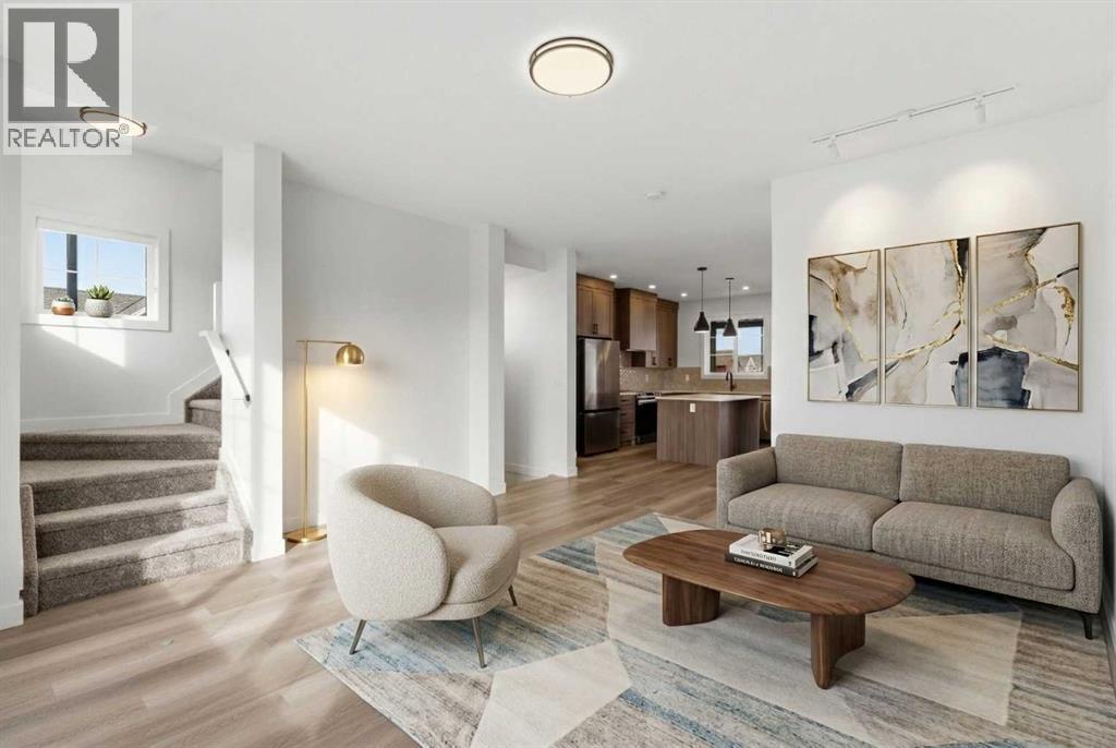 A sophisticated award winning END Unit 3-storey a Vesta Elevate Collection nested in Cooper’s Crossing, an 13th-time recipient of Airdrie’s "Best Community" award. This modern masterpiece seamlessly blends contemporary architecture with upscale interior finishes, offering a versatile layout that includes 3 bedrooms, 2.5 bathrooms, and a ground-floor flex room perfect for a home office or gym. The heart of the home is a bright, open-concept main floor anchored by a gourmet kitchen featuring full-height cabinetry, sleek modern finishes, and generous prep space that flows effortlessly into the dining and living areas. Upstairs, the deluxe primary suite serves as a private retreat, complemented by secondary bedrooms that are impressively oversized compared to typical townhome designs. Beyond the stylish interior, this home boasts a rare and highly coveted parking setup: a double attached garage plus two additional private driveway stalls. Perfectly positioned across from Cooper’s Town Promenade, you’ll enjoy walkable access to Starbucks, Save-On-Foods, and local dining, while nearby parks and school. This the ultimate low-maintenance sanctuary for professionals and families alike who refuse to compromise on convenience for "elevated" living. Please note: Entrance Level 235 total sq ft, living space 675 total sq ft, Upper level (bedrooms) 681 sq ft. (id:6769