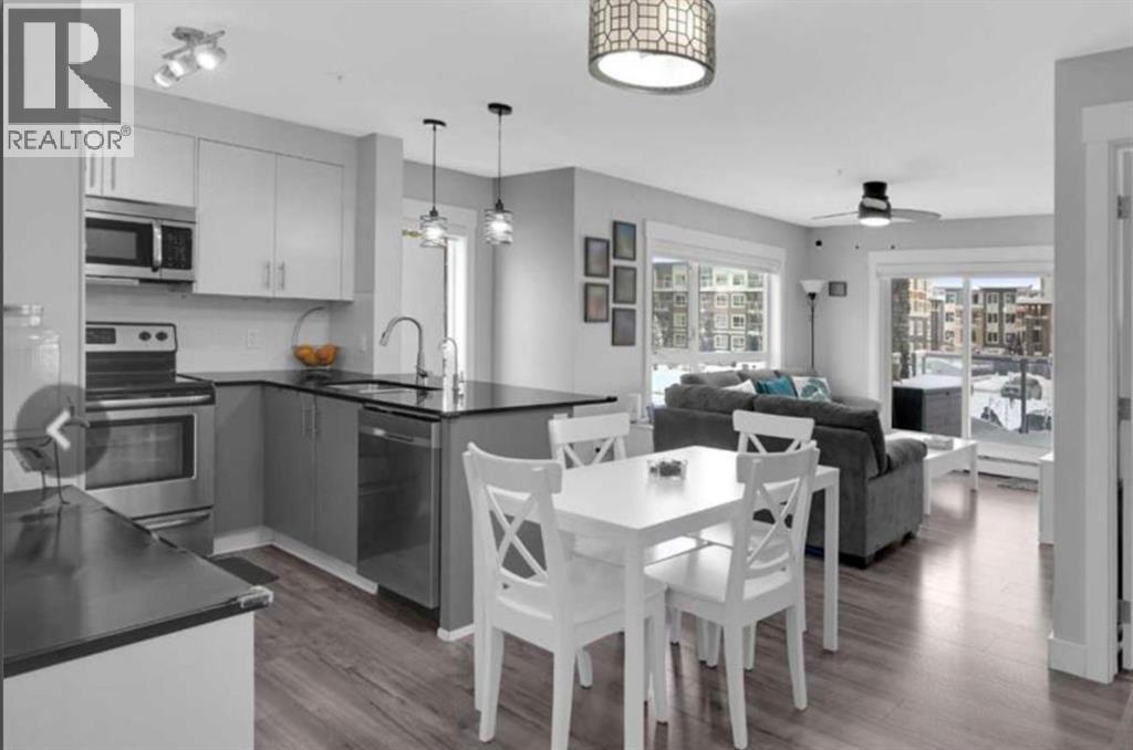 Welcome to this beautifully maintained and UPGRADED CORNER UNIT CONDO, located on the second floor offers over 943.5 sq ft of comfortable living space, featuring 2 spacious bedrooms, 2 full bathrooms, and the convenience of titled heated underground parking and secure caged storage locker. As you enter, you’ll be greeted by an open-concept design that includes a well-appointed kitchen, a dining area, and a versatile flex space perfect for an office. The kitchen is a chef’s dream, featuring a large counter with bar seating, granite countertops, stainless steel appliances. The owner has invested over $15k in upgrades including CUSTOM CABINETRY , HALL TREE ENTRYWAY BENCH ,COAT RACK with SHOE STORAGE, SMART LOCK for main DOOR , WATER PURIFIER ,SAMSUNG DISHWASHER, NEW LIGHT FIXTURES( Kitchen and dining) and BOTH WASHROOMS FIXTURES, New VINYL PLANK FLOORING (no carpet) has been installed throughout the unit, PATIO TILES, REMOTE CONTROLLED ZEBRA BLINDS for all windows and CEILINGS FANS in both bedrooms and Living room add extra convenience and comfort and beautiful Balcony to spend time with friends ,enjoying BBQ.Located in the vibrant Skyview Ranch community, this condo offers easy access to local amenities, parks, schools, shopping, and major roadways. Whether you're a first-time homebuyer, a growing family, or someone looking for a modern, low-maintenance property, (id:6769