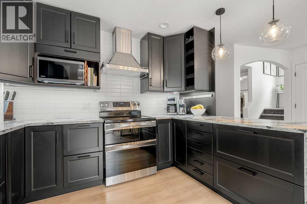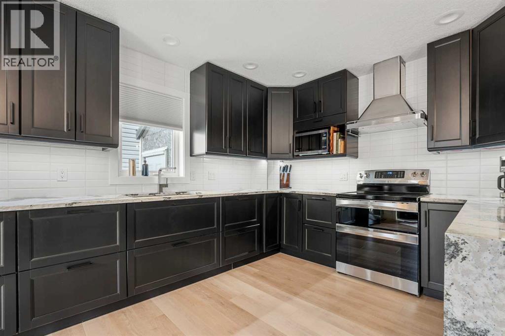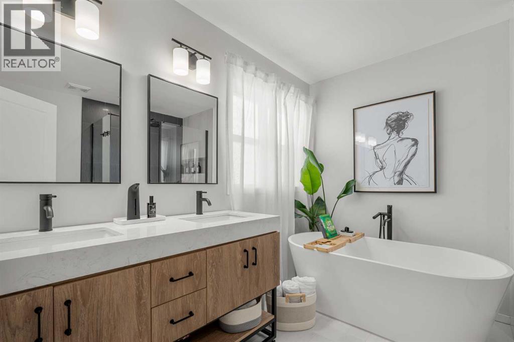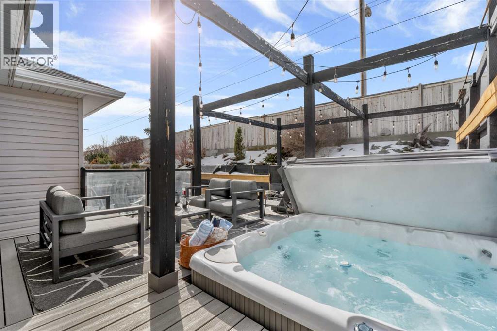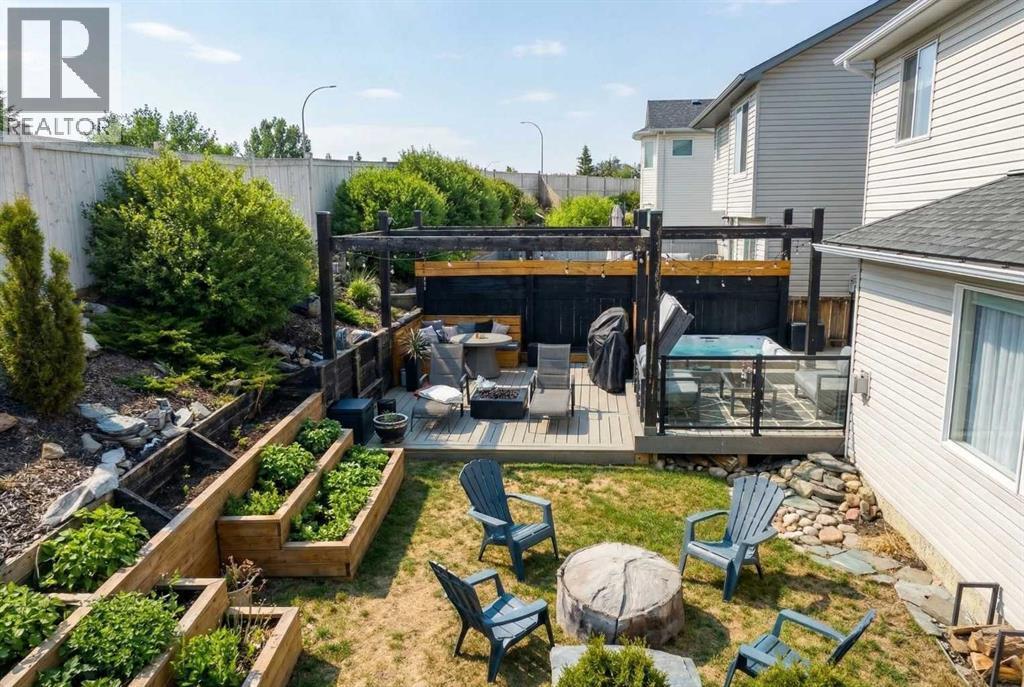 Welcome to this beautifully updated, top-to-bottom renovated home located in the desirable Fairways community of Airdrie, just minutes from Woodside Golf Course and conveniently close to Veterans Blvd NW, offering quick access to major routes, parks, and everyday amenities.This well-maintained property offers 3 spacious bedrooms upstairs, 2.5 bathrooms on the upper levels, plus a fully finished basement that includes an additional bedroom, a full bathroom, and a dedicated office space, making it perfect for growing families, remote work, or guests.Inside, the home showcases thoughtful upgrades throughout. The modern kitchen is designed for both functionality and style, featuring quality cabinetry, modern countertops, a stunning waterfall island, built-in dishwasher, stylish wine cabinet, and an electric range with double ovens, making it ideal for cooking, hosting, and everyday living.The primary ensuite has been beautifully renovated into a spa-like retreat, complete with a glass shower with built-in niche, upgraded plumbing fixtures, a relaxing standalone tub, and a stylish double vanity. The primary closet features a barn-style sliding door and built-in organizers, adding both character and practical storage.The fully finished basement adds valuable living space and includes a cozy electric fireplace, an additional bedroom, full bathroom, and a private office space, offering flexibility for work, guests, or extended family.Step outside to the true highlight of the home — the resort-style backyard, thoughtfully designed for relaxation and entertaining. The outdoor space features a pergola-covered seating area with privacy screen, a relaxing hot tub, cozy firepit area, raised garden beds, and a spacious deck perfect for gatherings. An L-shaped built-in bench seating area adds charm and functionality, creating the perfect place to host family and friends.Additional upgrades throughout the home include custom laundry storage, built-in closets, accent wall s, upgraded baseboards, modern lighting fixtures, and stylish ceiling fans, giving the entire home a polished, move-in-ready feel.Located in one of Airdrie’s most family-friendly neighbourhoods, and just minutes from golf, parks, green spaces, and major roadways, this home offers the perfect combination of comfort, lifestyle, and convenience. (id:6769