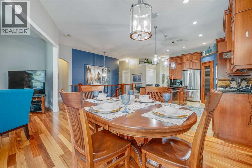 "WELCOME TO YOUR DREAM HOME" An exquisite custom walkout bungalow nestled on an exquisite, landscaped lot, on a quiet culdesac backing onto beautiful Crystal Ridge Golf Course. The home features vaulted ceilings, tigerwood hardwood floors, air conditioning, and numerous extras. The spacious open design includes a living/family room with a gorgeous stone fireplace for cozy evenings, a lovely dining area for formal times, a chef's gourmet haven including a gas range, a built-in oven & warmer, loads of cupboards, granite counters, walk in pantry, and a fantastic huge island for entertaining. The primary bedroom features a walk in closet and five piece ensuite complete with a therapeutic air bath tub. Eating area has access to the wrap around deck to enjoy the beautiful privacy and the evening sun. For convenience, laundry and a powder room on main floor. Lower walkout level features a family/games/theatre room for enjoyable fun times. There are an additional two bedrooms, an office/den, and three piece bathroom, as well as space for a gym. The patio area features a beautiful hot tub, and steps away, a cozy firepit. The numerous extras include underground sprinkler system, Allure outside lighting, water lines in garage and on deck, air conditioning, all closets with auto lights, surround system upstairs in living & dining room, kitchen, ensuite and upper & lower deck, movie system downstairs with sub-woofer, and natural gas outlets on both upper & lower decks. Recent upgrades include roof shingles (2017), fridge with water & ice (2023), dishwasher (2024), microwave (2024), vacu flo (2023), new in slab heating pump (2024), 75 gallon hot water tank (2024), new blinds (2023). This home is located in a quiet long culdesac with a west facing back yard in beautiful Okotoks. The annual HOA gives access to Crystal Shores lake just blocks away. Don't miss viewing this lovely home, its PRECIOUS! No sign on property. (id:6769