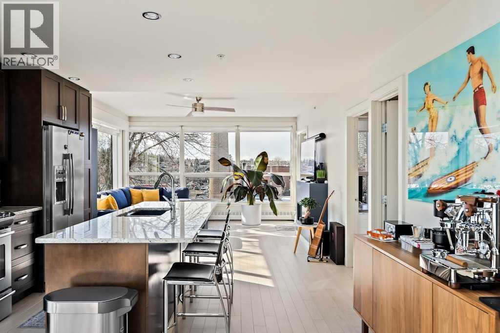Fantastic 2 bedroom 2 full bath Penthouse at “Tweed” with double-height ceilings and ROOF DECK. 10 reasons to LOVE this exciting suite: 1) Newer white-oak hardwood flooring…upgraded from the original dark laminate and adds to the brightness and sophistication 2) Open plan with huge windows…great light quality 3) The best parking stall in the building…over 12’ wide and right beside the elevator 4) the parking stall has been electrified for an EV charger 5) two storage units...one on the 4th floor close to the unit and one on the main floor…perfect for sports equipment, tires etc. 6) 125+ sq ft ROOF DECK with sunny west exposure, views of the Mount Royal hill and newer wood decking 7) new electronic door lock (can be unlocked from your phone) and chimes when door is opened. 8) air conditioning added 9) 2 large bedrooms that will easily hold king-size beds 10) custom professional window shades with valances…when it’s time for privacy. Tweed enjoys a fantastic location on a tree-lined Street, just off 17th Avenue with endless amenities and a couple of the blocks to the 4th street village. Tweed is a red brick and solid concrete building…no PTC. (id:6769