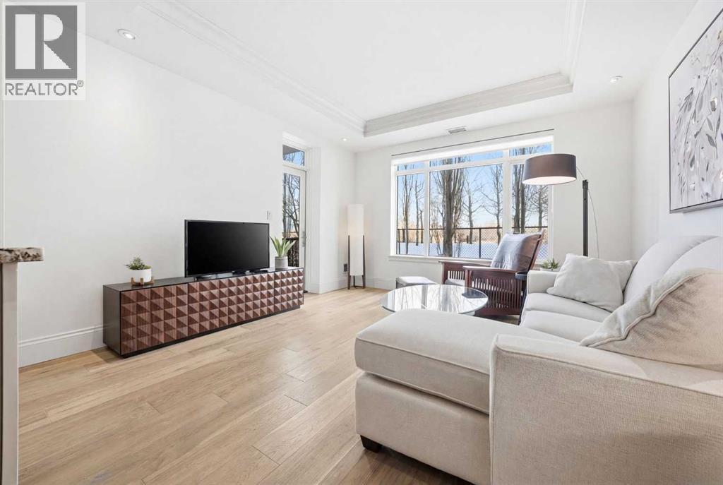 Experience a sophisticated, low-maintenance lifestyle in this luxury main-floor condo located in the Champagne building, South Calgary’s premier residence. Backing onto serene green space just steps from the Bow River, this home features 10-foot ceilings, rich engineered hardwood floors, and estate-level finishes throughout. The gourmet kitchen is a chef's dream, boasting 42-inch soft-close cabinetry, upscale stainless steel appliances, polished granite countertops, and a massive island designed for entertaining. The primary bedroom offers a private retreat with new custom Hunter Douglas blackout blinds and a lavish marble-tiled ensuite with a separate soaking tub and shower. The concrete construction of this pet-friendly building ensures exceptional quiet and durability. Modern conveniences abound, including central air conditioning, a gas BBQ line, titled storage, and a titled underground parking stall near the elevator with access to a two-stall car wash. Located in the master-planned community of Quarry Park, you are minutes away from miles of river pathways, an off-leash park, and the world-class YMCA. With condo fees that cover heat, gas, and water, this well-managed complex offers a holistic living experience that combines nature, quality, and convenience. (id:6769