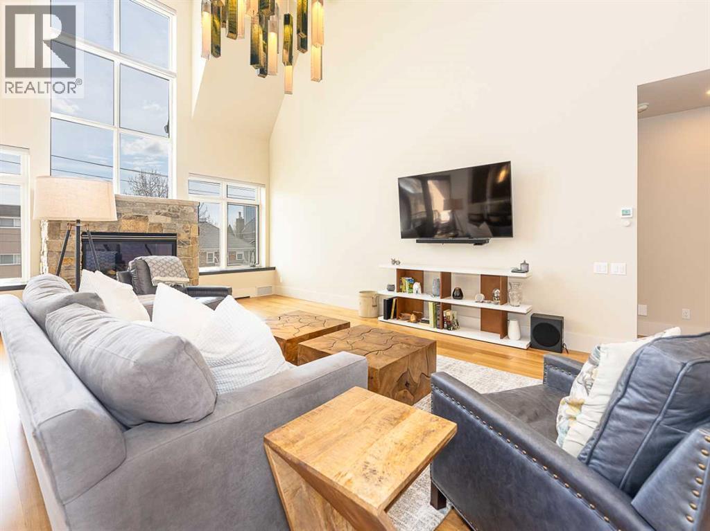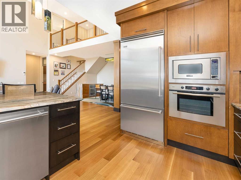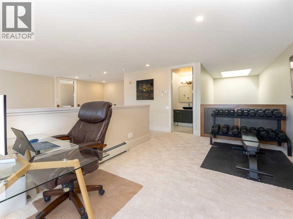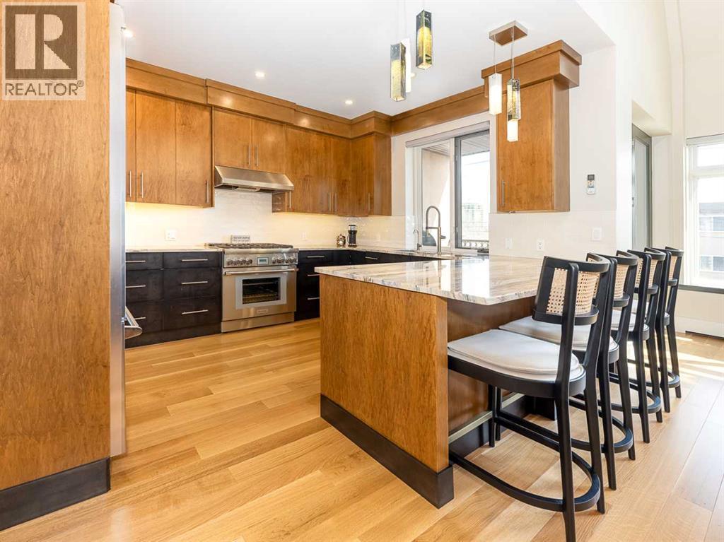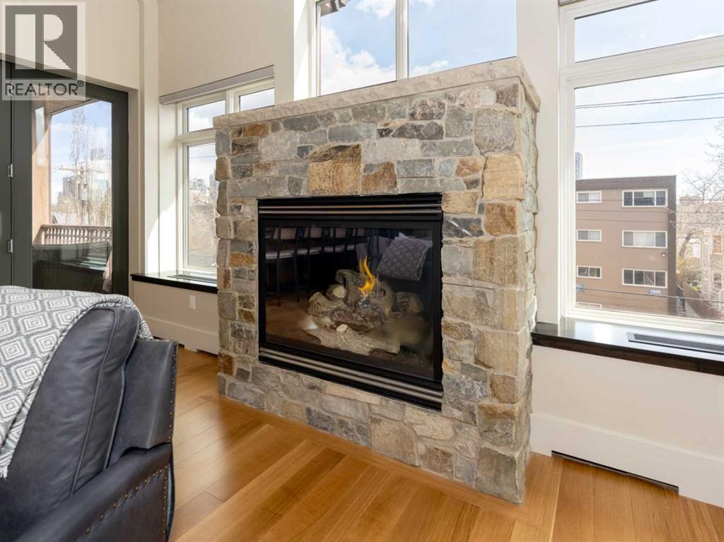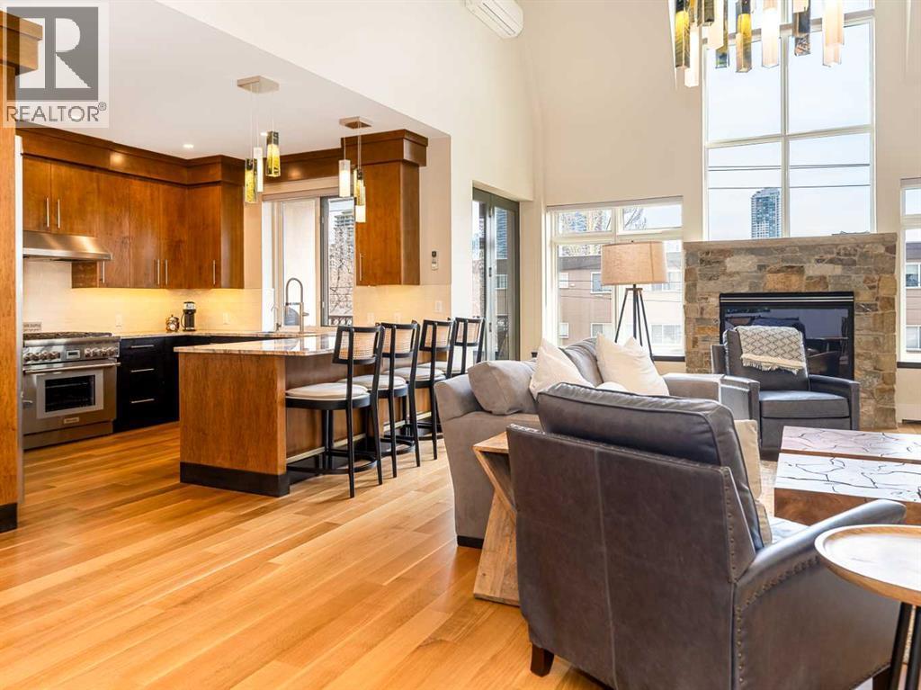 Luxury and sophistication converge in this meticulously renovated penthouse in the heart of Hillhurst. Just steps from Kensington’s vibrant shops and restaurants, the Bow River pathways, and the downtown core, this exceptional residence offers an elevated urban lifestyle. Situated in the boutique 12-unit Villagio building, constructed with superior ICF for outstanding soundproofing and energy efficiency, the home features a semi-private elevator that opens directly to the unit’s entrance. A grand foyer with soaring ceilings and an overhead skylight sets the tone as you enter this impressive two-level residence. The open-concept design is highlighted by dramatic 18-foot ceilings and a stunning south-facing wall of windows that fills the space with natural light. The central living room showcases a custom stone gas fireplace and a striking imported 120-piece hand-blown glass chandelier. Patio doors lead to one of two south-facing outdoor spaces, ideal for relaxing or entertaining. The chef’s kitchen is a true showpiece, featuring premium appliances including a Thermador dual-fuel gas range, Sapphire dishwasher, Viking refrigerator, and built-in microwave. Hand-selected quartzite countertops complement the space, while imported custom light fixtures add refined character. Adjacent to the kitchen, the dining area features a custom wine display with oak racking and a built-in buffet complete with a wine fridge and quartzite counters. A distinctive custom light fixture adds warmth and elegance to the space. The main-level primary retreat offers built-in cabinetry and a luxurious spa-inspired ensuite with dual sinks, Hansgrohe fixtures, quartzite countertops, a steam shower, and a custom cast-iron slipper tub. The suite is completed by a spacious walk-in closet. A powder room and convenient laundry area complete the main floor. The upper level features a second bedroom with access to a large in-suite storage room, a three-piece bathroom, and a versatile flex space ideal fo r a home office. A catwalk overlooking the living area below leads to patio doors that open onto the second south-facing patio, creating another private outdoor retreat. Extensive renovations throughout the home include new quarter-sawn engineered oak flooring on the main level, newer carpeting upstairs, modern railings overlooking the living room, fresh paint, and new remote-controlled window coverings. Comfort is enhanced by a newly installed Fujitsu mini-split four-zone inverter system, providing flexible climate control with independent heating, cooling, or fan settings for individual areas. The unit also includes two titled parking stalls, both generously sized to accommodate a full-size truck. This remarkable penthouse must be experienced in person to be fully appreciated. (id:6769