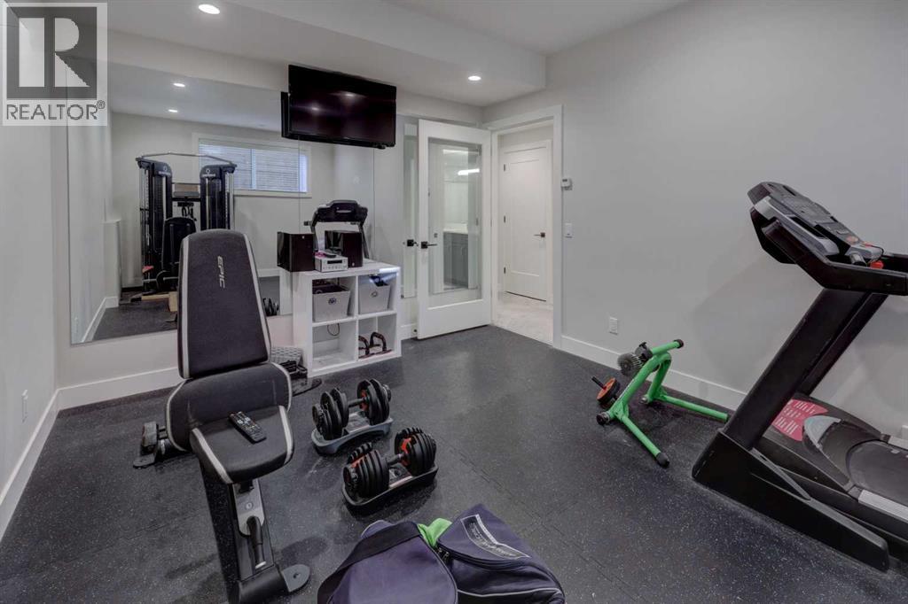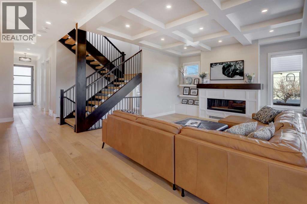 Luxury, location & thoughtful design come together in this exceptional custom-built home by William Blake Homes, just five blocks from both Marda Loop & River Park. Built in 2021, this elegant 2-storey home offers over 3600 sq. ft beautifully finished living space with amazing downtown skyline views from the upper level. A signature feature of this home is its outdoor spaces; set on an expansive (41’x126’) fully landscaped corner lot, the back yard with beautiful mature trees & elevated outdoor gathering spaces includes a covered deck with gas fireplace & built-in speakers, & large concrete patio with hot tub. The striking exterior showcases stucco, stone & faux-wood accents, timber beams & exposed aggregate steps & walkways, as well as Lumenox permanent outdoor lighting. This property includes underground sprinklers, gas bbq outlet & heated oversized (26’x21’) double garage with epoxy floors & built-in shelves. This bespoke home has a highly functional floor plan & professionally curated design. Every detail was lovingly chosen, including stunning designer lighting. Inside, natural light floods through large triple-glazed windows, highlighting wide-plank white oak hardwood floors on both the main & upper levels including the floating stairs. The main floor features a private office with built-in cabinetry, a family room with oversized windows, coffered ceiling, linear gas fireplace, custom millwork, & a large & bright dining area. The chef’s kitchen showcases KitchenAid appliances including a 6 burner gas stove, built-in oven & microwave, elegant tile backsplash, & an expansive quartz island with beverage fridge & extra storage. There’s also a walk-in pantry with window, pocket sliding door, & custom cabinetry for small appliances. The mudroom has been purposefully designed with a bench, cubbies, cupboards & even a built-in dog door! Upstairs, you’ll find a spacious bonus room with linear gas fireplace, custom millwork & built-in desk; an upper laundry room with qu artz counter, sink & ample storage; & a stylish 4 piece bathroom with full tile tub/shower combo, tile floors & quartz counters. The luxurious primary retreat overlooks the backyard, offering views of downtown & the property’s gorgeous mature trees (there’s access to the private upper patio to soak in the views). The primary bedroom features a spacious walk-in closet with barn door, custom built-ins & mirror. The spa-like ensuite features tile floors, dual sinks, luxurious soaker tub, large tiled shower & private water closet. Two additional bedrooms are finished with carpet & include closet organizers. The lower level showcases a media/games room with custom millwork, speakers, & wet bar. There’s a gym with mirrored wall & rubber flooring, a 4th bedroom, & a full bathroom. This home includes central air conditioning, & is wired for data, security & speakers throughout. The mechanical system is upgraded including a Daiken Multizone furnace, HRV, infloor heating, & o/s high efficiency hot water heater. (id:6769