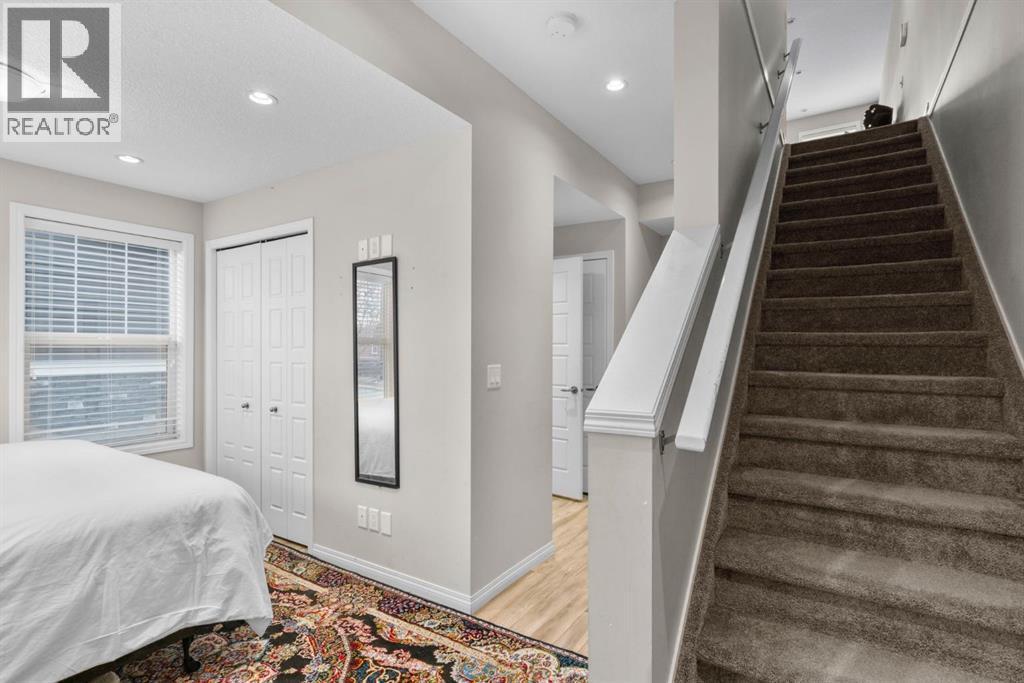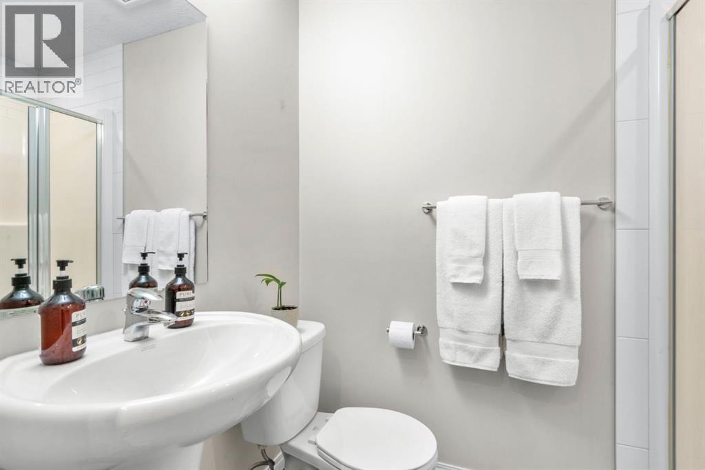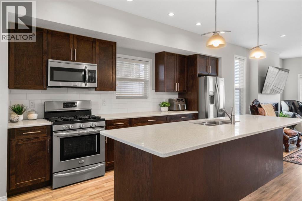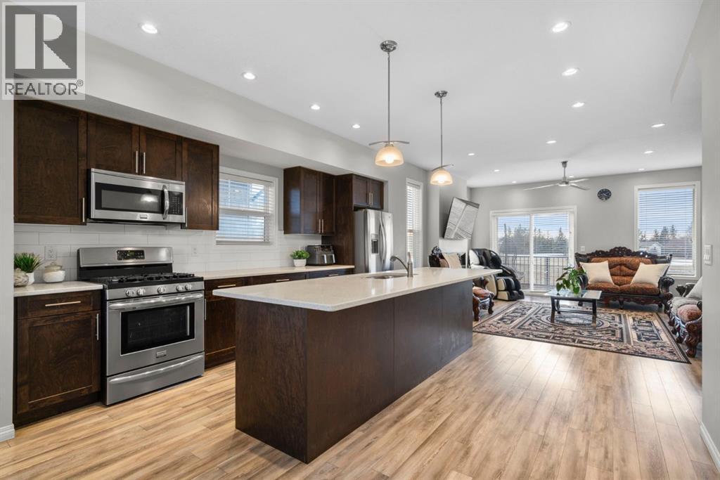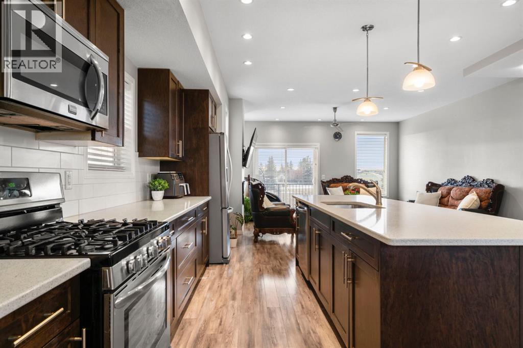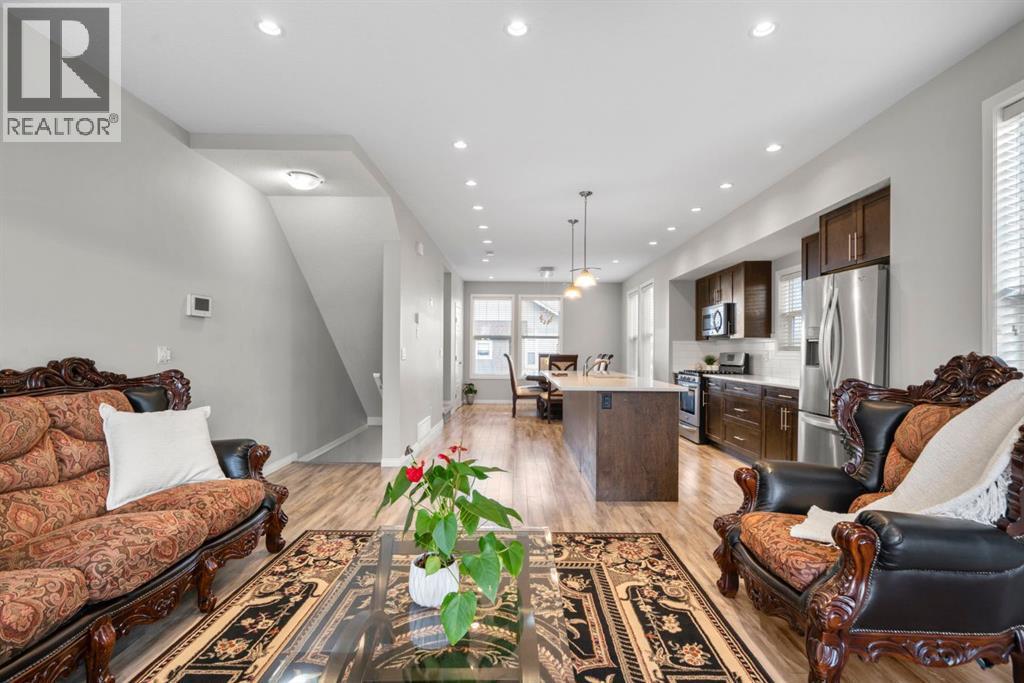 Welcome to this beautifully maintained three-level townhouse in the desirable community of Williamstown in Airdrie, offering 1,718.22 sq ft of well-designed living space, a functional layout, and a rare double attached garage. The ground-level entry provides a welcoming first impression with durable flooring and a bright, practical layout. This level features a spacious office space—ideal for guests, a home office, or multi-generational living—along with a full 3-piece bathroom, offering excellent flexibility and privacy. The main living level showcases an inviting open-concept floor plan designed for both everyday living and entertaining. The kitchen is the heart of the home, featuring quartz countertops, dark cabinetry, stainless steel appliances, a classic subway tile backsplash, and a large central island with seating. The kitchen flows seamlessly into the dining area and spacious living room, where a contemporary electric fireplace adds warmth and style. Large windows flood the space with natural light, and sliding doors lead to a private balcony—perfect for morning coffee or evening relaxation. A convenient main-floor powder room completes this level. Upstairs, the home continues to impress with three additional bedrooms, including a generous primary retreat featuring a 4-piece ensuite and ample closet space. A second full bathroom serves the additional bedrooms, while upper-floor laundry adds everyday convenience and efficiency. Outside, enjoy open sightlines and green space views, enhancing both privacy and lifestyle appeal. Located in a well-maintained complex, this home is close to walking paths, parks, schools, shopping, and offers easy access to major commuter routes. This move-in-ready townhouse delivers the perfect blend of space, comfort, and location—ideal for families, professionals, or investors seeking a low-maintenance lifestyle in one of Airdrie’s most welcoming communities. (id:6769