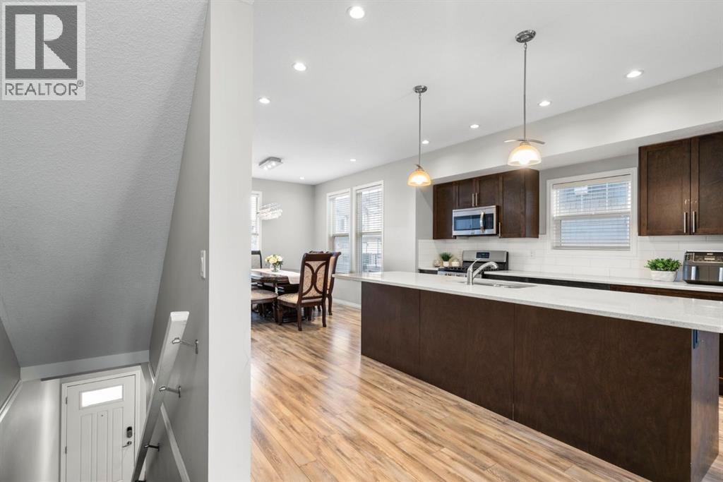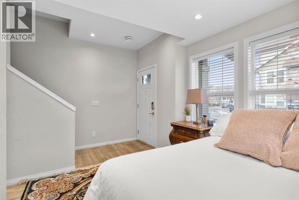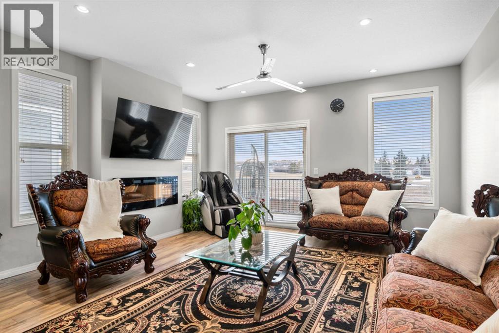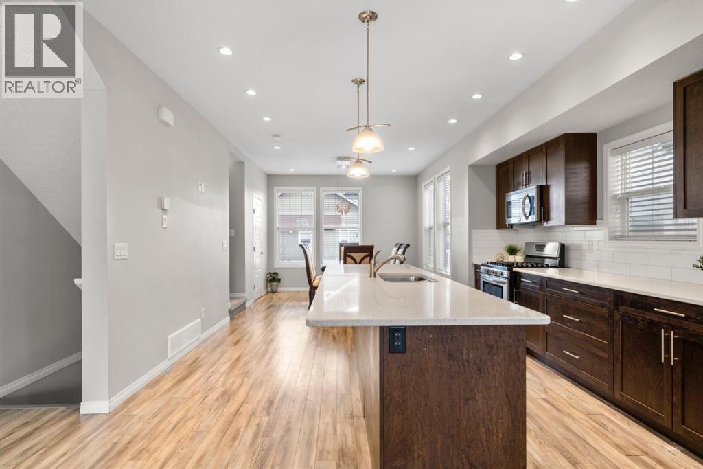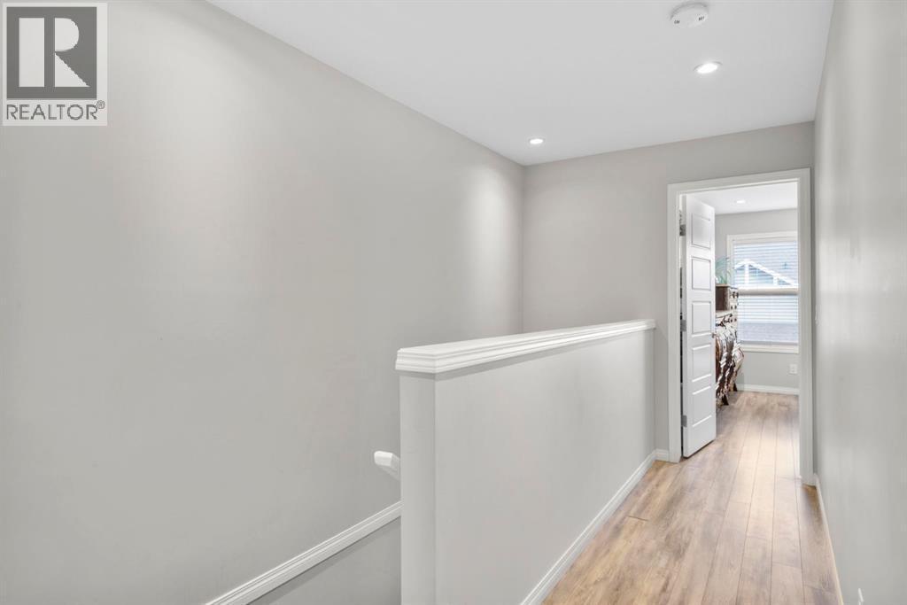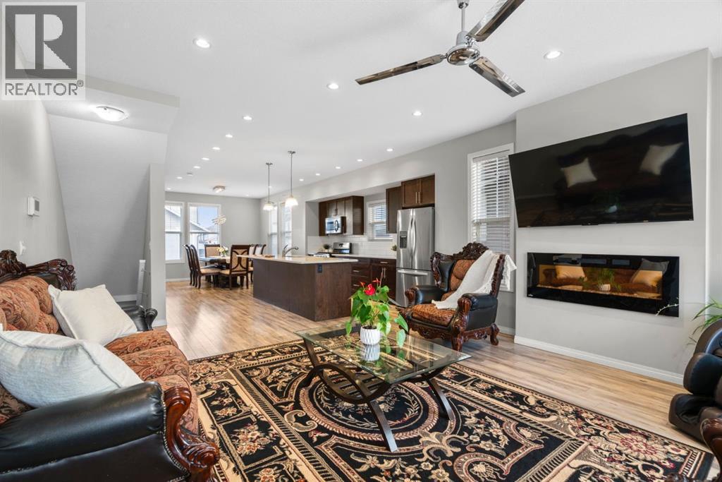 Welcome to this beautifully maintained three-level townhouse in the desirable community of Williamstown in Airdrie, offering 1,718.22 sq ft of well-designed living space, a functional layout, and a rare double attached garage. The ground-level entry provides a welcoming first impression with durable flooring and a bright, practical layout. This level features a spacious office space—ideal for guests, a home office, or multi-generational living—along with a full 3-piece bathroom, offering excellent flexibility and privacy. The main living level showcases an inviting open-concept floor plan designed for both everyday living and entertaining. The kitchen is the heart of the home, featuring quartz countertops, dark cabinetry, stainless steel appliances, a classic subway tile backsplash, and a large central island with seating. The kitchen flows seamlessly into the dining area and spacious living room, where a contemporary electric fireplace adds warmth and style. Large windows flood the space with natural light, and sliding doors lead to a private balcony—perfect for morning coffee or evening relaxation. A convenient main-floor powder room completes this level. Upstairs, the home continues to impress with three additional bedrooms, including a generous primary retreat featuring a 4-piece ensuite and ample closet space. A second full bathroom serves the additional bedrooms, while upper-floor laundry adds everyday convenience and efficiency. Outside, enjoy open sightlines and green space views, enhancing both privacy and lifestyle appeal. Located in a well-maintained complex, this home is close to walking paths, parks, schools, shopping, and offers easy access to major commuter routes. This move-in-ready townhouse delivers the perfect blend of space, comfort, and location—ideal for families, professionals, or investors seeking a low-maintenance lifestyle in one of Airdrie’s most welcoming communities. (id:6769