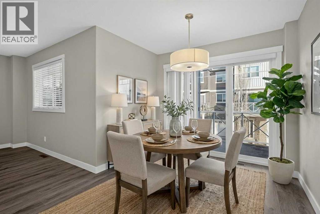 Welcome to Skyview Ranch Grove — a beautifully maintained multi-level townhouse offering modern finishes, smart design, and comfortable everyday living. From the moment you step inside, you’ll notice the pride of ownership and lightly lived-in condition that gives this home the feel of a new build. Contemporary cabinetry, quality flooring, and sleek countertops create a clean, modern aesthetic that’s both stylish and practical. The main living level is thoughtfully designed with an open-concept layout where the living room, dining area, and kitchen flow seamlessly together. High ceilings enhance the sense of space and allow natural light to move freely throughout. Whether you're entertaining guests or enjoying a quiet evening at home, the layout keeps everyone connected while still feeling spacious and comfortable. The kitchen is generously sized and highly functional, offering ample counter space, modern cabinetry, and excellent ventilation. It’s designed for real life — easy meal prep, everyday organization, and effortless hosting. A built-in Heat Recovery Ventilator (HRV) improves air quality and energy efficiency year-round. Upstairs, you’ll find two well-sized bedrooms that provide flexibility for a variety of needs. The primary bedroom offers a comfortable retreat with plenty of room for a full bedroom set, while the second bedroom works perfectly as a guest room, child’s room, or home office. Two bathrooms help keep daily routines running smoothly. Ideally located near parks, walking paths, K–9 schools including Apostles of Jesus and Prairie Sky School, and major amenities such as CrossIron Mills and the airport, this home offers convenience without sacrificing comfort. Modern, functional, and move-in ready — a perfect fit for first-time buyers, young families, or investors looking for quality in a growing community. (id:6769