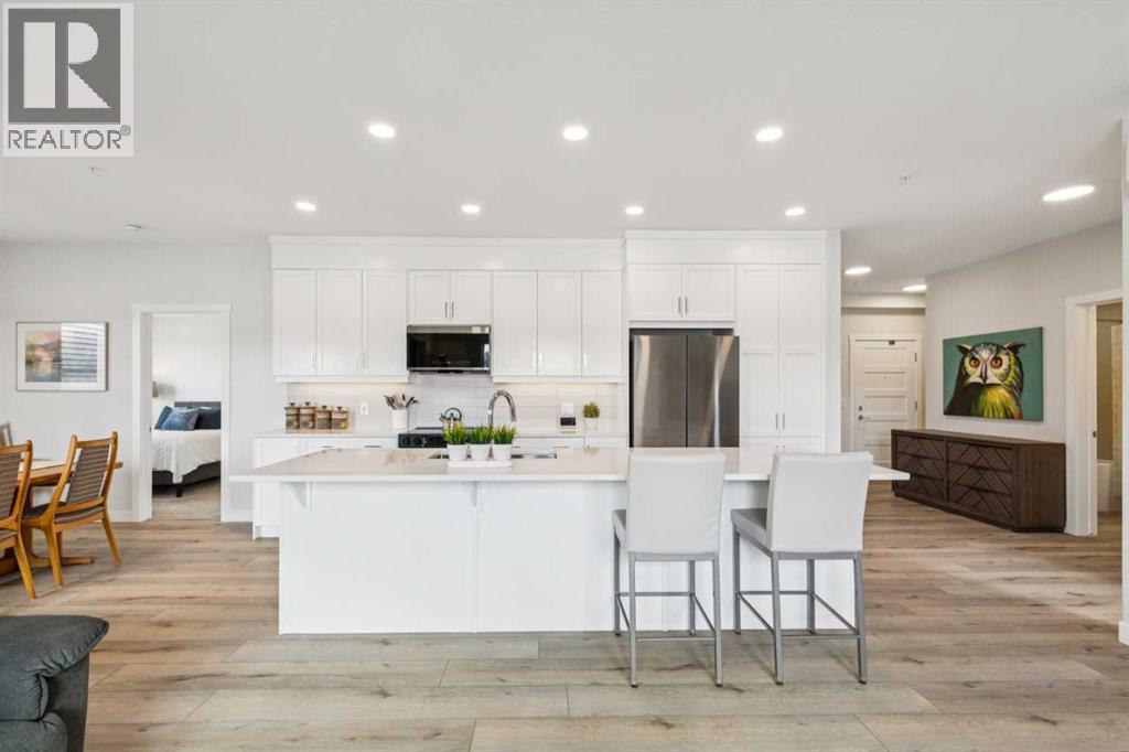 Welcome to Bow 360 in the vibrant and sought-after community of Wolf Willow, where this beautifully appointed, air-conditioned corner-unit condo offers one of the largest and most desirable floorplans in the complex. From the moment you step inside, you’ll appreciate the bright, open-concept design highlighted by expansive windows that flood the home with natural light and showcase lovely views of surrounding parks and green spaces. The elegant kitchen is both stylish and functional, featuring crisp white cabinetry, sleek quartz countertops, durable vinyl plank flooring, and an impressive oversized island with seating—perfect for casual dining, morning coffee, or gathering with friends and family. The kitchen flows seamlessly into the generous living room and a separate dining area spacious enough for a full dining suite, creating an inviting space ideal for both comfortable everyday living and sophisticated entertaining. Just off the dining area, step onto the spacious corner deck—an ideal outdoor retreat with gas bib for BBQing and overlooking the surrounding community green space and parks, including the 'Woof Willow Dog Park'. This thoughtfully designed home offers two spacious bedrooms, including a refined primary suite complete with its own private ensuite bathroom, along with a second full four-piece bathroom that provides comfort and convenience for guests or family. A private den with elegant French doors adds versatility and charm, making it the perfect space for a stylish home office, reading room, or flex area. Completing the package, this exceptional unit includes two titled parking stalls and an additional paid storage unit, providing outstanding convenience and valuable extra space. Theres also an additional tire storage room in the building available on a rental basis and subject to availability. Located just moments from the Bow River and its extensive network of scenic walking and cycling pathways, residents of Wolf Willow enjoy an incredible balan ce of urban convenience and access to nature, with beautiful river valley landscapes, parks, and outdoor recreation right outside your door while still being minutes from everyday amenities, shopping, dining, and major commuter routes—making this a rare opportunity to own a spacious, light-filled, and elegantly finished home in one of Calgary’s most exciting riverside communities. (id:6769