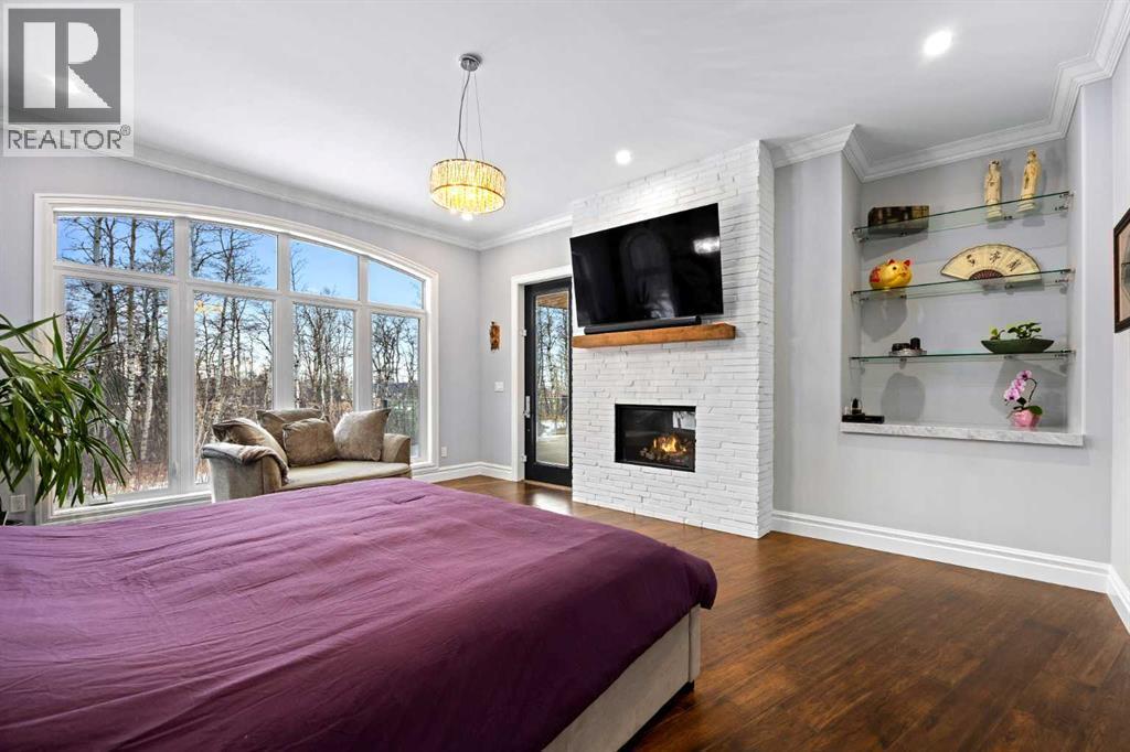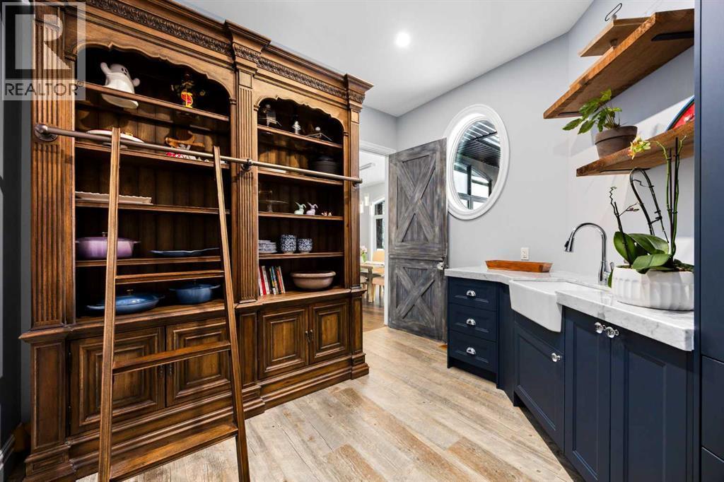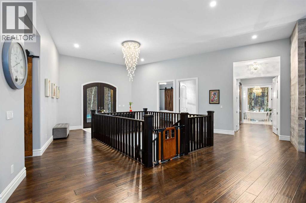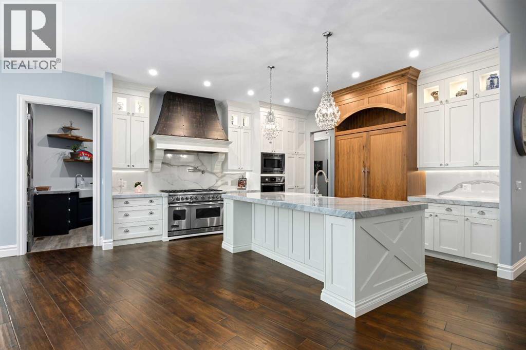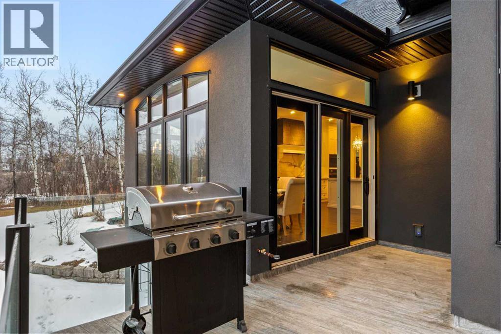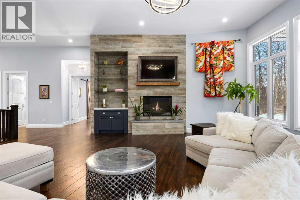 As the city fades in your rearview mirror and the trees begin to rise around you, the pace begins to change. Beyond the gates, 3.16 acres of manicured grounds unfold, bordered by environmental reserves and riding trails along two sides. What awaits is not simply an acreage, but a private estate retreat—an escape from the fast pace of the city, where space, quiet, and nature take the lead.Perfectly positioned just minutes from Calgary’s city limits and only ten minutes to Okotoks, this three-bedroom, two-bathroom walkout executive bungalow offers the rare privilege of rural tranquility without sacrificing location and urban convenience.Inside, more than 3,400 square feet of main-floor living is defined by openness and scale. Twelve-foot ceilings crown the principal living area, while ten-foot ceilings throughout the remainder of the home maintain a sense of architectural harmony, openness, and space. Expansive windows frame mature trees, filling the interior with natural light and creating a seamless connection to the surrounding landscape.At the heart of the home, the kitchen is both striking and functional. A substantial gas range with grill and copper hood anchors the space, complemented by a built-in wall oven, warming drawer, and full-size refrigerator and freezer wrapped in custom maple-stained cabinetry. The oversized island becomes a natural gathering place, equally suited to quiet morning coffee or elegant entertaining, while a well-appointed butler’s pantry with sink provides additional prep space, generous storage, and seamless flow for hosting.The primary suite offers a retreat within the home. Enter through double doors to a serene space warmed by a gas fireplace framed in sandblasted Italian marble, with windows overlooking the aspen canopy beyond. The ensuite feels reminiscent of a private spa, finished in marble tile with a deep soaker tub beside an oversized picture window, a walk-in glass-enclosed shower, dual vanities, and an expansive walk -in closet with illuminated built-in cabinetry. Direct access to the stunning covered rear deck invites relaxed moments outdoors beneath open prairie skies—an inviting place to unwind and take in the surrounding landscape. The walkout lower level presents an opportunity to expand the estate further, offering ten-foot ceilings, rough-ins for three additional bathrooms, a separate furnace, and access to a stamped concrete patio with pine ceiling and recessed lighting. A dedicated podcast studio is already in place, ideal for entrepreneurs, executives, or creators seeking a private professional space at home.An oversized triple garage, RV parking, paved driveway, gated entry, and a discreet fenced dog run complete the property.This is country living redefined—where privacy, craftsmanship, convenience, and space come together to create a home that feels both grounded in nature and effortlessly refined. (id:6769