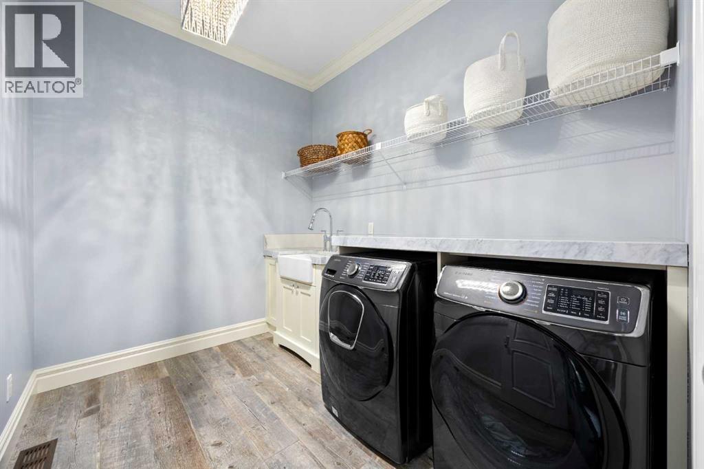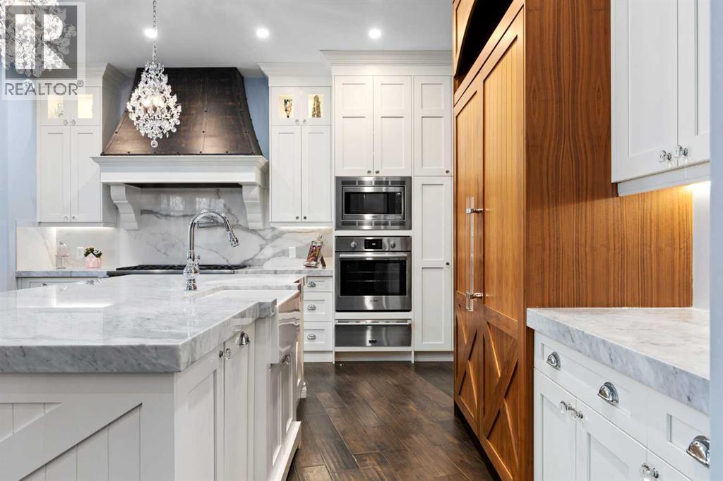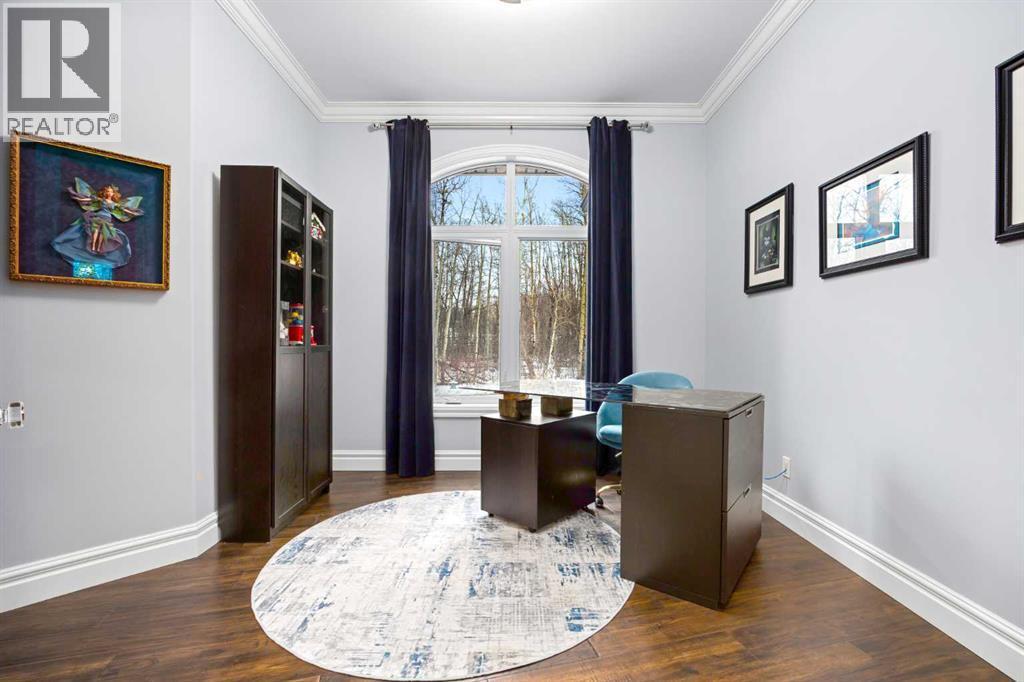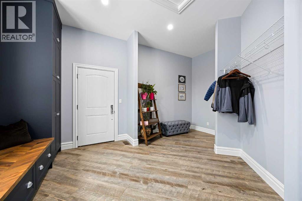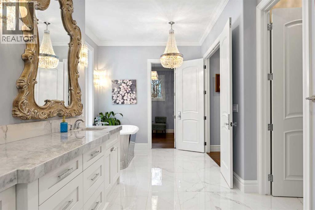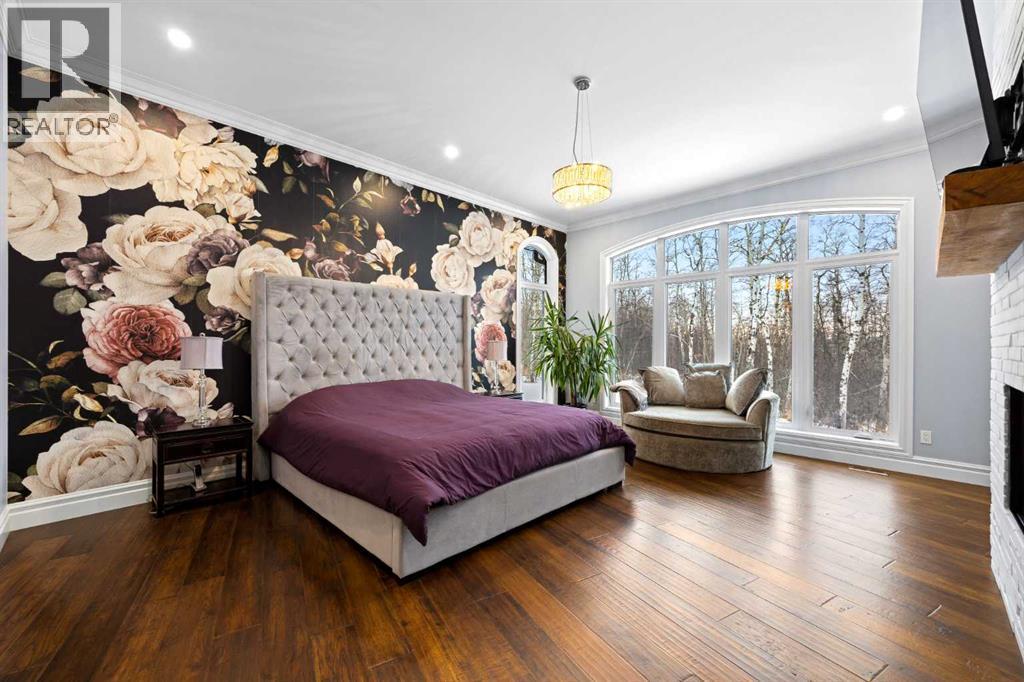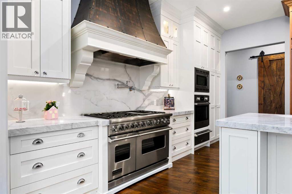 As the city fades in your rearview mirror and the trees begin to rise around you, the pace begins to change. Beyond the gates, 3.16 acres of manicured grounds unfold, bordered by environmental reserves and riding trails along two sides. What awaits is not simply an acreage, but a private estate retreat—an escape from the fast pace of the city, where space, quiet, and nature take the lead.Perfectly positioned just minutes from Calgary’s city limits and only ten minutes to Okotoks, this three-bedroom, two-bathroom walkout executive bungalow offers the rare privilege of rural tranquility without sacrificing location and urban convenience.Inside, more than 3,400 square feet of main-floor living is defined by openness and scale. Twelve-foot ceilings crown the principal living area, while ten-foot ceilings throughout the remainder of the home maintain a sense of architectural harmony, openness, and space. Expansive windows frame mature trees, filling the interior with natural light and creating a seamless connection to the surrounding landscape.At the heart of the home, the kitchen is both striking and functional. A substantial gas range with grill and copper hood anchors the space, complemented by a built-in wall oven, warming drawer, and full-size refrigerator and freezer wrapped in custom maple-stained cabinetry. The oversized island becomes a natural gathering place, equally suited to quiet morning coffee or elegant entertaining, while a well-appointed butler’s pantry with sink provides additional prep space, generous storage, and seamless flow for hosting.The primary suite offers a retreat within the home. Enter through double doors to a serene space warmed by a gas fireplace framed in sandblasted Italian marble, with windows overlooking the aspen canopy beyond. The ensuite feels reminiscent of a private spa, finished in marble tile with a deep soaker tub beside an oversized picture window, a walk-in glass-enclosed shower, dual vanities, and an expansive walk -in closet with illuminated built-in cabinetry. Direct access to the stunning covered rear deck invites relaxed moments outdoors beneath open prairie skies—an inviting place to unwind and take in the surrounding landscape. The walkout lower level presents an opportunity to expand the estate further, offering ten-foot ceilings, rough-ins for three additional bathrooms, a separate furnace, and access to a stamped concrete patio with pine ceiling and recessed lighting. A dedicated podcast studio is already in place, ideal for entrepreneurs, executives, or creators seeking a private professional space at home.An oversized triple garage, RV parking, paved driveway, gated entry, and a discreet fenced dog run complete the property.This is country living redefined—where privacy, craftsmanship, convenience, and space come together to create a home that feels both grounded in nature and effortlessly refined. (id:6769