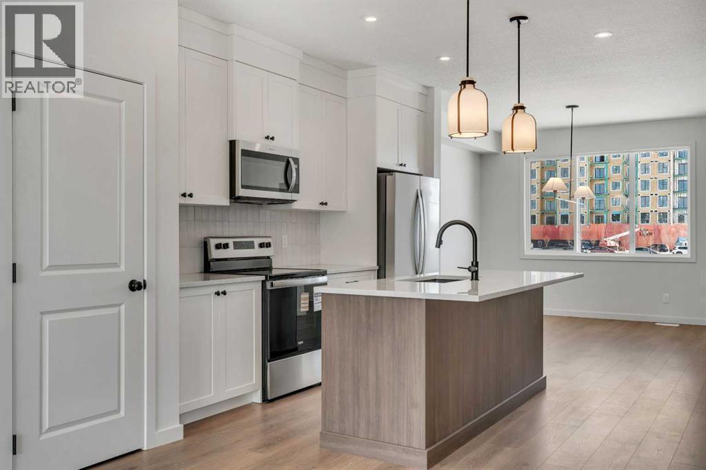 Welcome to 231 Bartlett Crescent SE, a stunning and contemporary haven nestled in the vibrant community of Rangeview. This bright and spacious home offers a seamless blend of modern design and functional living. Step through the inviting front porch into the sun-drenched open-concept great room, where expansive windows bathe the space in natural light. At the heart of the home is the beautifully designed center kitchen, featuring cabinets extended to the ceiling, a large central island perfect for casual dining and entertaining, and designer-curated finishes throughout, including quartz countertops, a silgranit sink, and sleek black plumbing fixtures.  Upstairs, retreat to the expansive primary bedroom, a true sanctuary complete with an upgraded ensuite featuring double sinks, a glass shower, and a spacious walk-in closet offering ample storage. The upper level also includes a convenient laundry room, a full bathroom, and generously sized additional bedrooms, perfect for family living or hosting guests. The basement includes a 3-piece rough-in, offering excellent potential for future development. Additional thoughtful upgrades include a side door entrance with upgraded laminate landing, providing flexibility for future basement access or separate living space. A separate traditional rear entrance can be used for direct access to the yard and future garage. Enjoy outdoor living with an east-facing backyard, ideal for morning sun and relaxing evenings. Perfectly situated in the growing community of Rangeview, this home is just steps from the future Commercial Village, Harvest Hall, and Community Greenhouse—connecting you to convenience, culture, and a vibrant community lifestyle. (id:6769