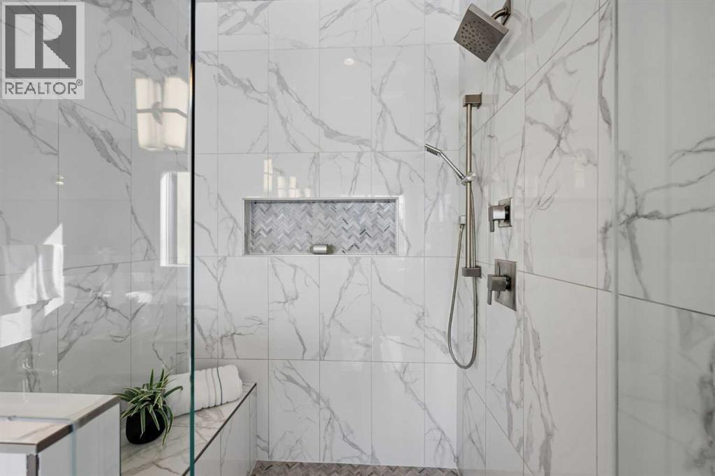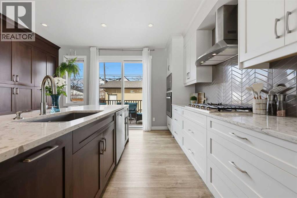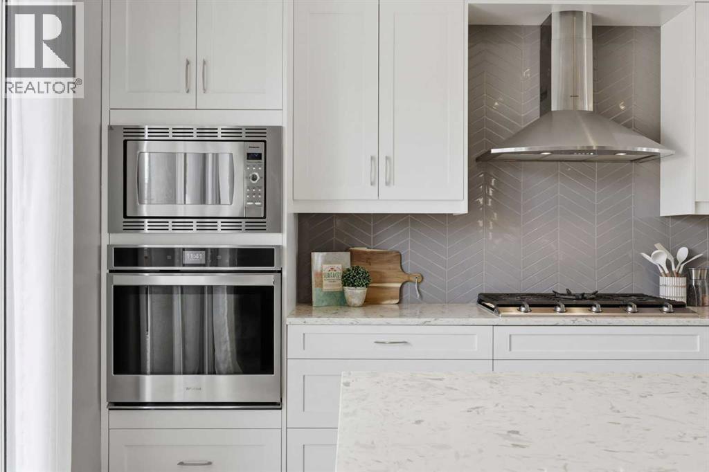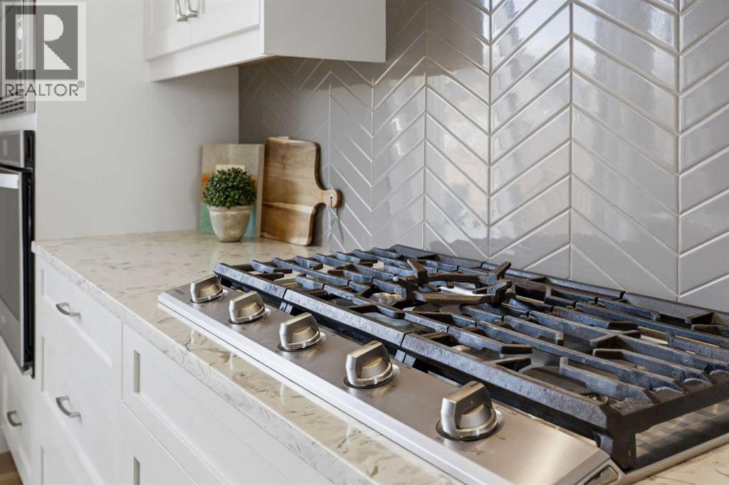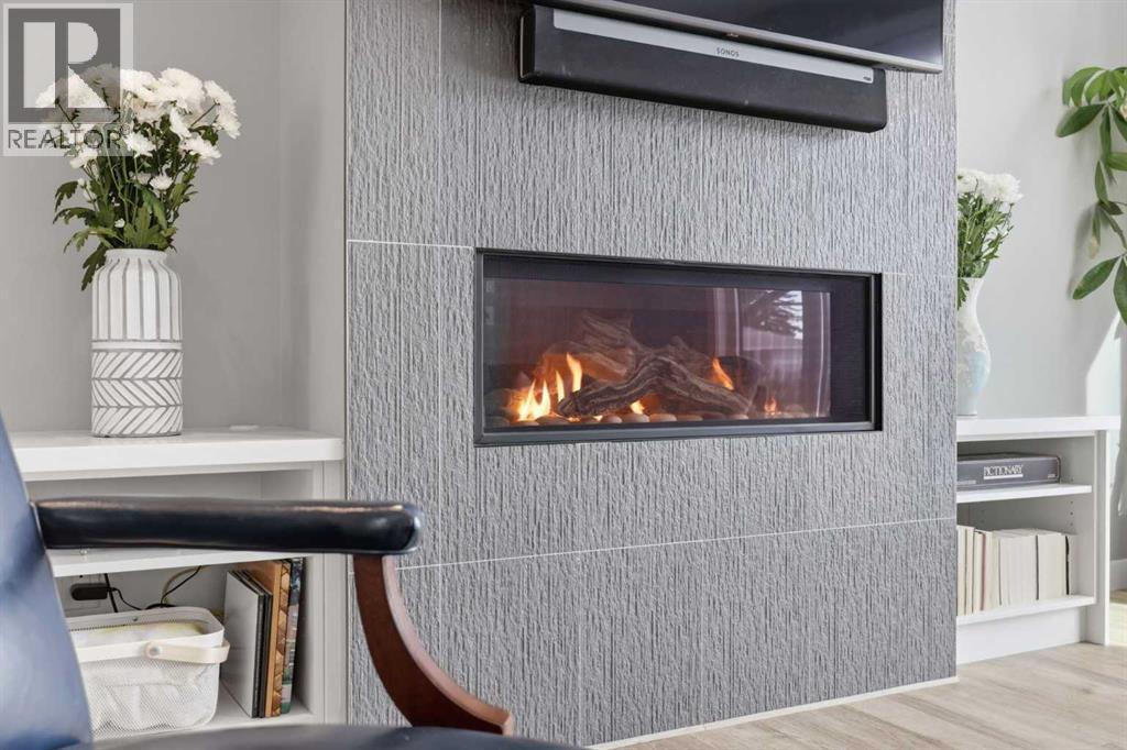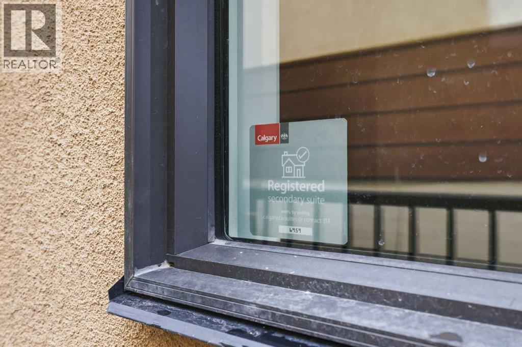 Discover this stunning, highly upgraded designer semi-detached infill offering over 3,250 sq ft of finely crafted living space in the vibrant community of Winston Heights. Featuring 5 bedrooms, 3.5 bathrooms, and a fully developed legal 2-bedroom basement suite with private entrance. Welcome to a bright, open main floor with soaring 9' ceilings, 8' doors, and rich wide-plank hardwood flooring. The living room centres around a dramatic gas fireplace clad in floor-to-ceiling textured grey stone tile, flanked by custom built-in cabinetry and oversized windows that frame direct park views. A dedicated main floor office offers the perfect work-from-home setup, while the spacious dining area flows into the show-stopping kitchen. Finished in a striking two-tone palette of crisp white full-height cabinetry paired with warm walnut lowers and a matching floor-to-ceiling built-in pantry, the kitchen features a glossy chevron herringbone backsplash, 5-burner gas cooktop, chimney hood fan, built-in wall oven and microwave, and a dedicated coffee and beverage station. The oversized quartz island with undermount black Blanco double sink seats four. A mudroom with built-in storage and stylish powder room complete the main level. Upstairs, the primary bedroom impresses with vaulted ceilings, a walk-in closet, treetop views, and a private balcony. The spa-inspired ensuite features a standalone soaker tub, glass-enclosed shower with built-in niche, dual-sink walnut vanity, brushed-nickel fixtures, sconce lighting, and Calacatta marble-look tile. Two additional bedrooms, a modern 4-piece bath, and a laundry room with side-by-side machines, upper cabinetry, and sink complete the upper level. Additional highlights include central air conditioning, a private west-facing backyard with wood deck, full fencing, and a double detached heated garage. The durable stucco exterior reflects the quality craftsmanship found throughout. The fully developed legal 2-bedroom lower suite (Suite #6959) off ers exceptional flexibility with its own private entrance, contemporary kitchen, full appliance package, spacious living area, 4-piece bath, and separate laundry. Residents of Winston Heights enjoy highly rated schools, a recreation and aquatic centre, golf, tennis, off-leash parks, scenic pathways, quick access to 16 Ave and Deerfoot, and downtown Calgary just minutes away. (id:6769