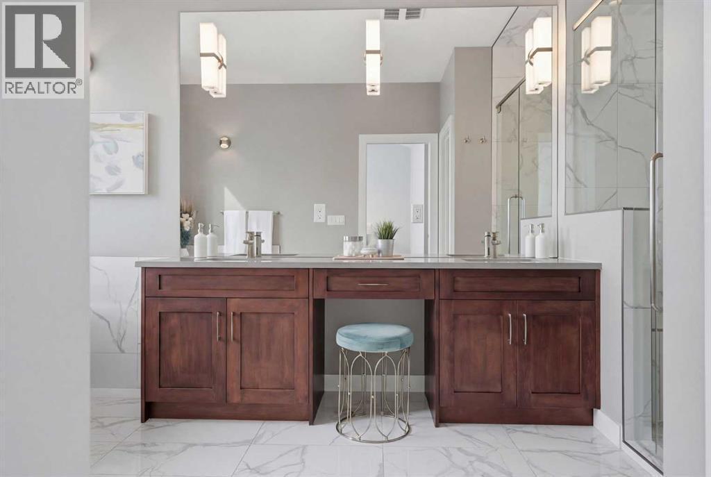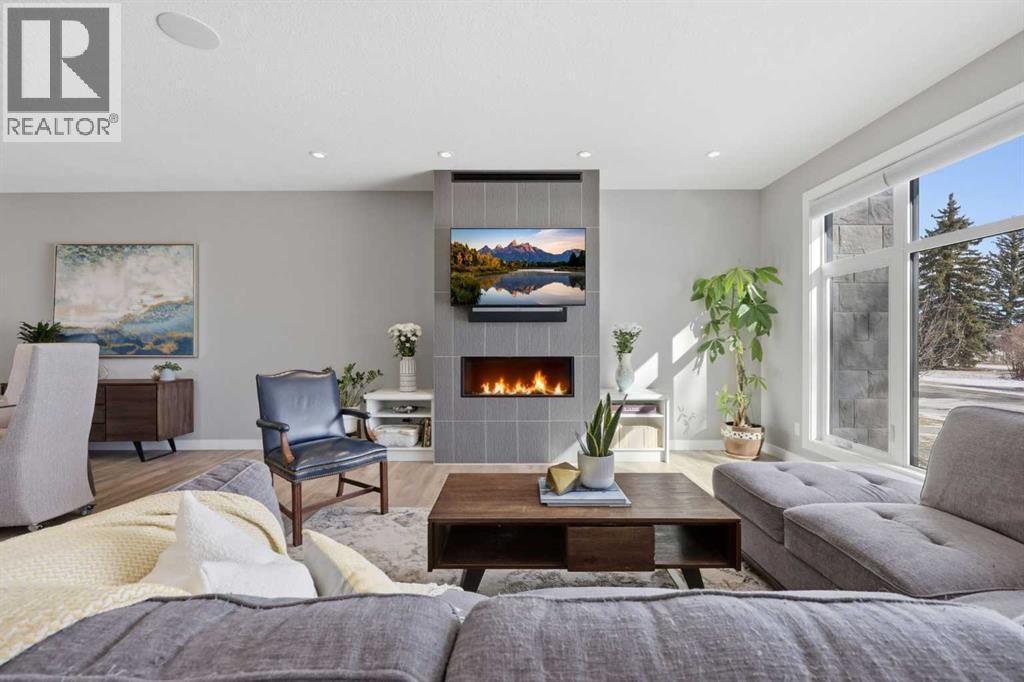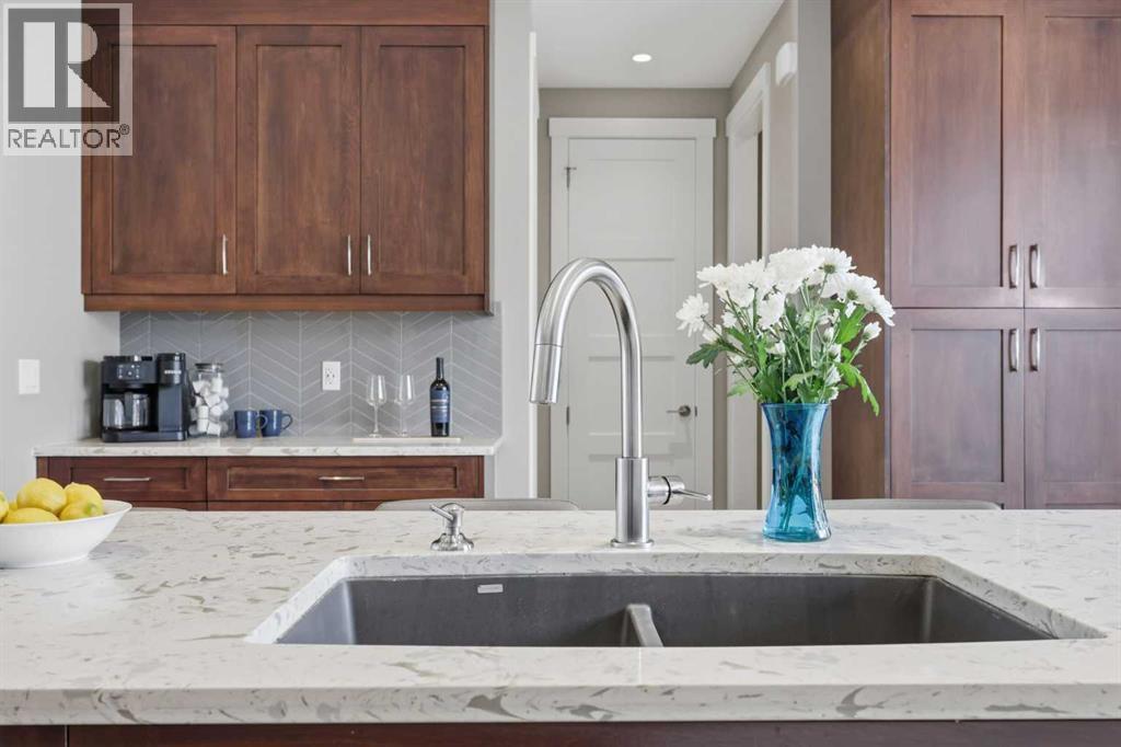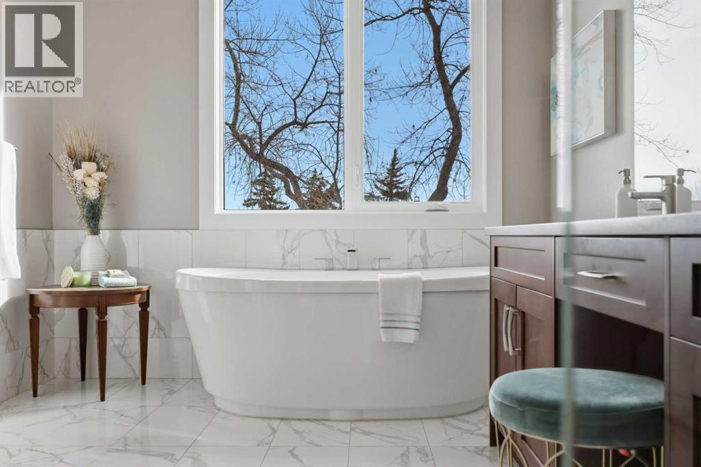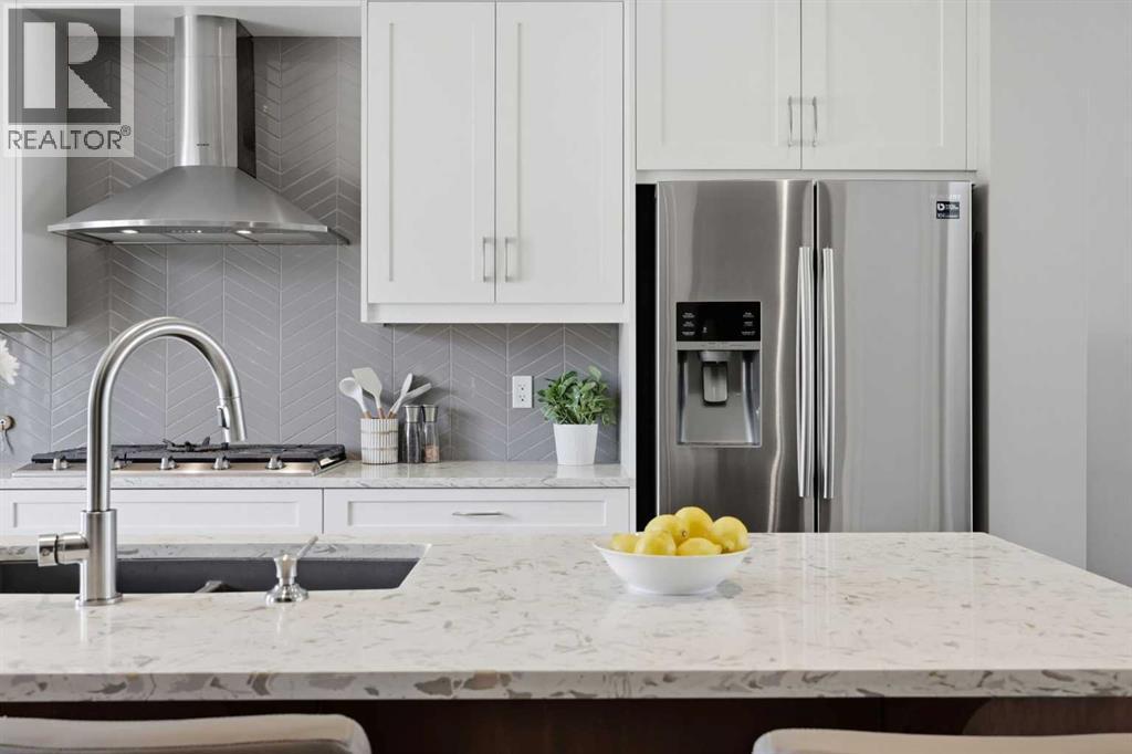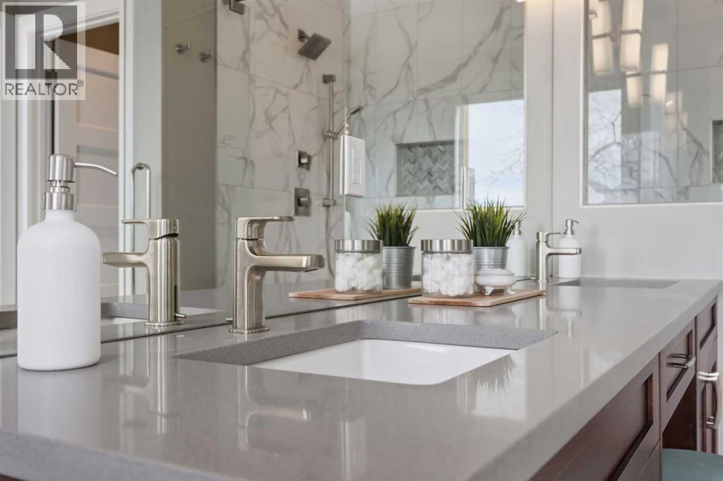 Discover this stunning, highly upgraded designer semi-detached infill offering over 3,250 sq ft of finely crafted living space in the vibrant community of Winston Heights. Featuring 5 bedrooms, 3.5 bathrooms, and a fully developed legal 2-bedroom basement suite with private entrance. Welcome to a bright, open main floor with soaring 9' ceilings, 8' doors, and rich wide-plank hardwood flooring. The living room centres around a dramatic gas fireplace clad in floor-to-ceiling textured grey stone tile, flanked by custom built-in cabinetry and oversized windows that frame direct park views. A dedicated main floor office offers the perfect work-from-home setup, while the spacious dining area flows into the show-stopping kitchen. Finished in a striking two-tone palette of crisp white full-height cabinetry paired with warm walnut lowers and a matching floor-to-ceiling built-in pantry, the kitchen features a glossy chevron herringbone backsplash, 5-burner gas cooktop, chimney hood fan, built-in wall oven and microwave, and a dedicated coffee and beverage station. The oversized quartz island with undermount black Blanco double sink seats four. A mudroom with built-in storage and stylish powder room complete the main level. Upstairs, the primary bedroom impresses with vaulted ceilings, a walk-in closet, treetop views, and a private balcony. The spa-inspired ensuite features a standalone soaker tub, glass-enclosed shower with built-in niche, dual-sink walnut vanity, brushed-nickel fixtures, sconce lighting, and Calacatta marble-look tile. Two additional bedrooms, a modern 4-piece bath, and a laundry room with side-by-side machines, upper cabinetry, and sink complete the upper level. Additional highlights include central air conditioning, a private west-facing backyard with wood deck, full fencing, and a double detached heated garage. The durable stucco exterior reflects the quality craftsmanship found throughout. The fully developed legal 2-bedroom lower suite (Suite #6959) off ers exceptional flexibility with its own private entrance, contemporary kitchen, full appliance package, spacious living area, 4-piece bath, and separate laundry. Residents of Winston Heights enjoy highly rated schools, a recreation and aquatic centre, golf, tennis, off-leash parks, scenic pathways, quick access to 16 Ave and Deerfoot, and downtown Calgary just minutes away. (id:6769