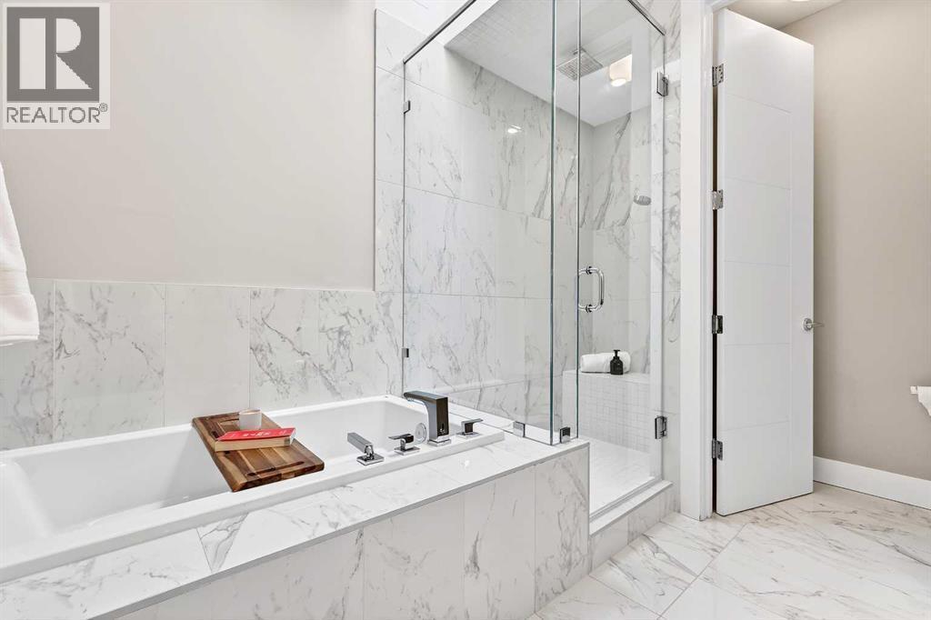 Ideally located on one of Glenbrook’s most desirable and well-established streets, this stunning fully finished contemporary infill offers exceptional design, quality craftsmanship, and a functional open-concept layout. The main floor showcases wide-plank engineered hardwood flooring, large windows that flood the space with natural light. The chef-inspired kitchen is beautifully designed with stainless steel appliances, quartz countertops, abundant two-tone cabinetry in white and wood finishes, and an oversized island with breakfast bar seating—perfect for both everyday living and entertaining. Adjacent to the kitchen, the spacious dining area easily accommodates gatherings of any size. The inviting living room features custom built-ins and a striking gas fireplace, creating a warm and stylish focal point. Expansive 8’ sliding doors lead to the private backyard retreat, an ideal place to relax after a long day. Completing the main level is a convenient 2-piece bathroom and a well-designed mudroom with built-in storage to keep everything organized and out of sight. Upstairs, the luxurious primary suite offers a peaceful retreat with a custom closet and an elegant spa-inspired ensuite featuring a large soaker tub, dual sinks, a stand-alone tiled shower with built-in bench seating, soaring ceilings, a stunning skylight, and a private water closet. Two additional generously sized bedrooms, a full 4-piece bathroom, and a convenient upper-level laundry area with stacking washer and dryer and sink complete this level. The fully developed basement, finished by the builder to the same high standard as the upper floors, provides incredible additional living space. This level includes a spacious recreation room perfect for a media area, playroom, or entertaining, along with a fully equipped wet bar featuring a sink, extensive cabinetry, and space for a bar or wine fridge. A fourth bedroom with a large walk-in closet and a full 4-piece bathroom make this level ideal for guests or extended family. Outside, enjoy low-maintenance landscaping, a beautiful deck perfect for summer evenings, and a double detached garage. Additional comfort is provided with central air conditioning, making the home enjoyable year-round. Situated on a quiet street yet close to everything, this exceptional home offers easy access to schools, shopping, downtown Calgary, 17th Avenue, grocery stores, public transit, and major roadways. A beautifully designed inner-city home with an undeniable WOW factor—this is one you won’t want to miss. (id:6769