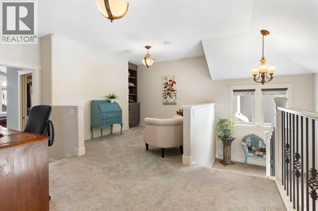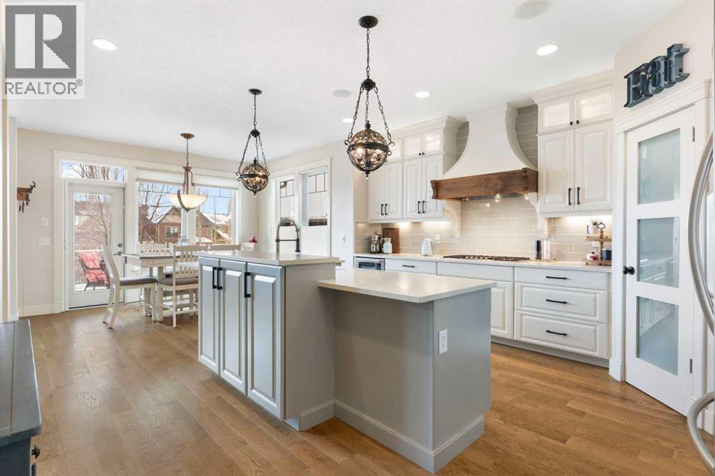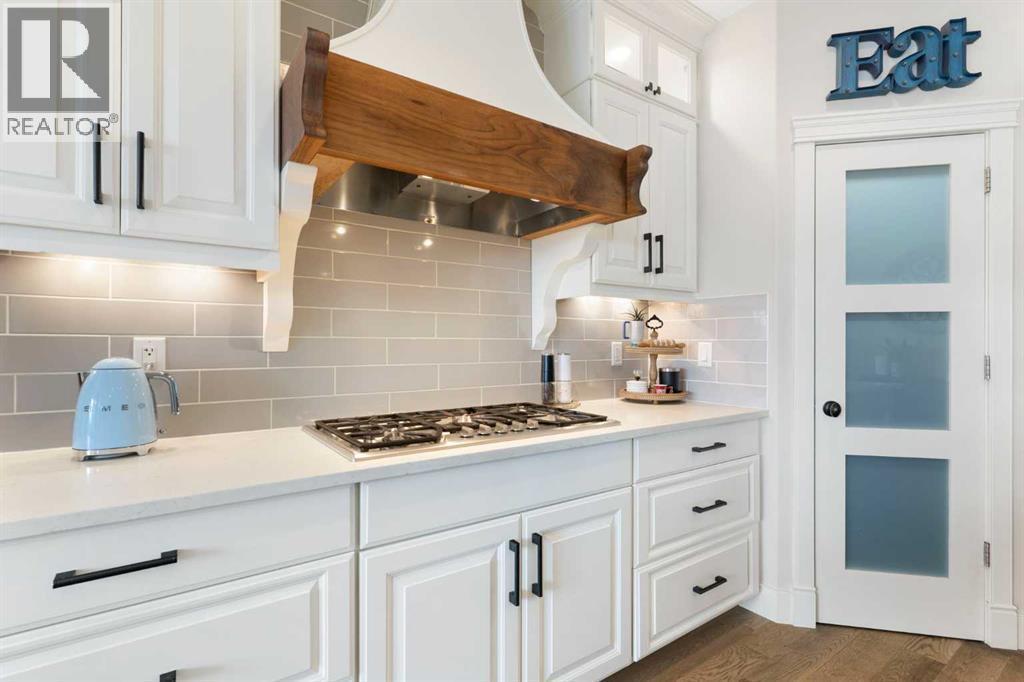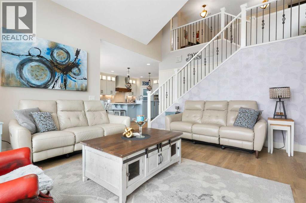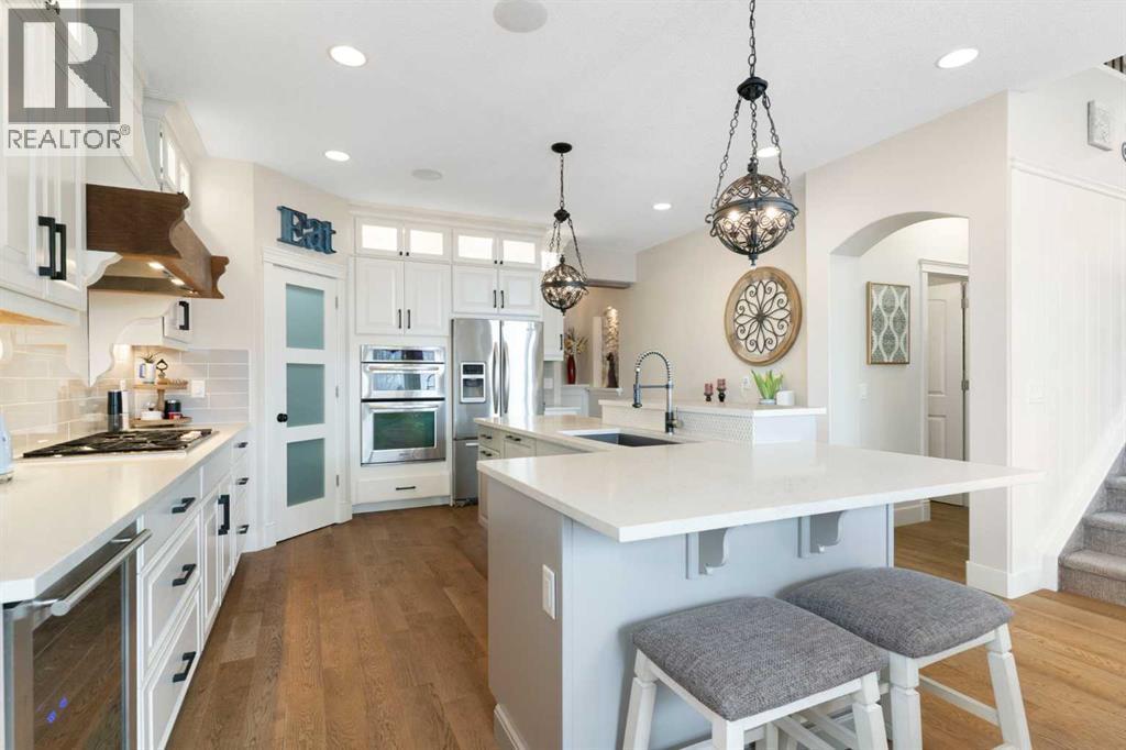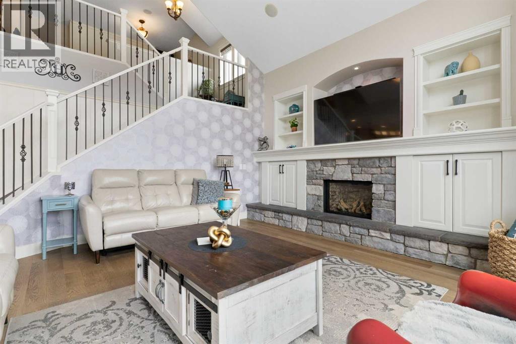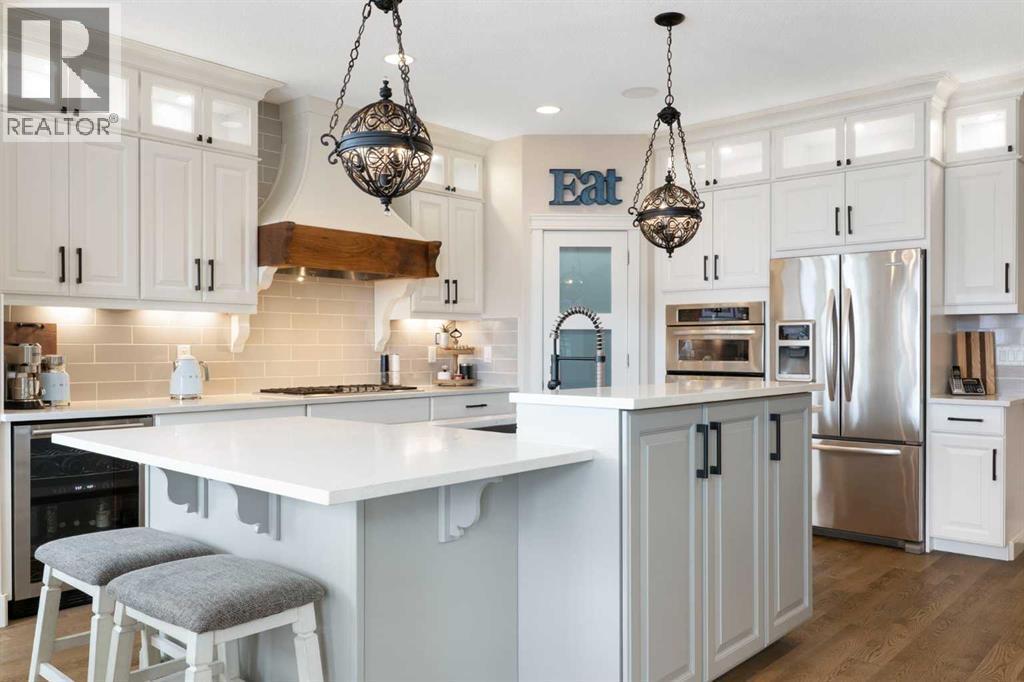 Hello, Gorgeous! Welcome to this beautifully renovated executive walkout home in the highly sought-after community of Coopers Crossing in Airdrie. Offering over 2,500sq ft. above grade plus a fully developed walkout basement, this home blends impressive architectural spaces with thoughtful custom finishes throughout. Step inside to a stunning entry featuring stacked stone accents, rustic beams, and an inviting sense of craftsmanship that continues throughout the home. The main floor includes a private office with glass French doors, perfect for working from home or flexible use as a dining space or additional bedroom. At the heart of the home is the dramatic great room with soaring 14-foot vaulted ceilings, arched windows, and a beautiful fireplace feature wall that fills the space with natural light from the west-facing backyard.The chef-inspired kitchen is designed for both everyday living and entertaining, featuring a large island, quartz countertops, professionally painted two-tone cabinetry, custom organizers, and a striking solid walnut hood fan. Premium appliances include KitchenAid, Bosch, Thermador, and MasterChef, along with a gas range, wall oven, beverage cooler, and walk-in pantry. Upstairs, a welcoming loft creates an additional living space for relaxing or family time. Two spacious bedrooms share a well-appointed bathroom, while the impressive primary retreat offers vaulted ceilings, custom wall detailing, and a luxurious ensuite with heated floors, double vanity, soaker tub & separate water closet. The fully developed walkout basement adds incredible flexibility with a gorgeous second full kitchen, large recreation area, full bathroom, wine/cool room, and a spacious additional bedroom or versatile flex room with built-in Murphy bed. With its high-end finishes and thoughtful layout, this level is ideal for entertaining or multi-generational living. Outdoor living is just as impressive with a west-facing backyard, a 300sq ft. Duradek balcony with glas s railing, natural gas line for BBQ, and a walkout patio below with additional gas connections and hot tub rough-in, plus two storage sheds. The beautifully landscaped yard features custom concrete work, mature trees and shrubs, and a 7-zone irrigation system. Completing the home is a triple attached garage plus shop area, with epoxy floors, forced-air heating, workshop wiring, EV/welder outlets, and extensive built-in storage. Located in one of Airdrie’s most desirable communities, close to parks, pathways, schools, and amenities, this exceptional home offers the perfect combination of space, luxury, and functionality. (id:6769