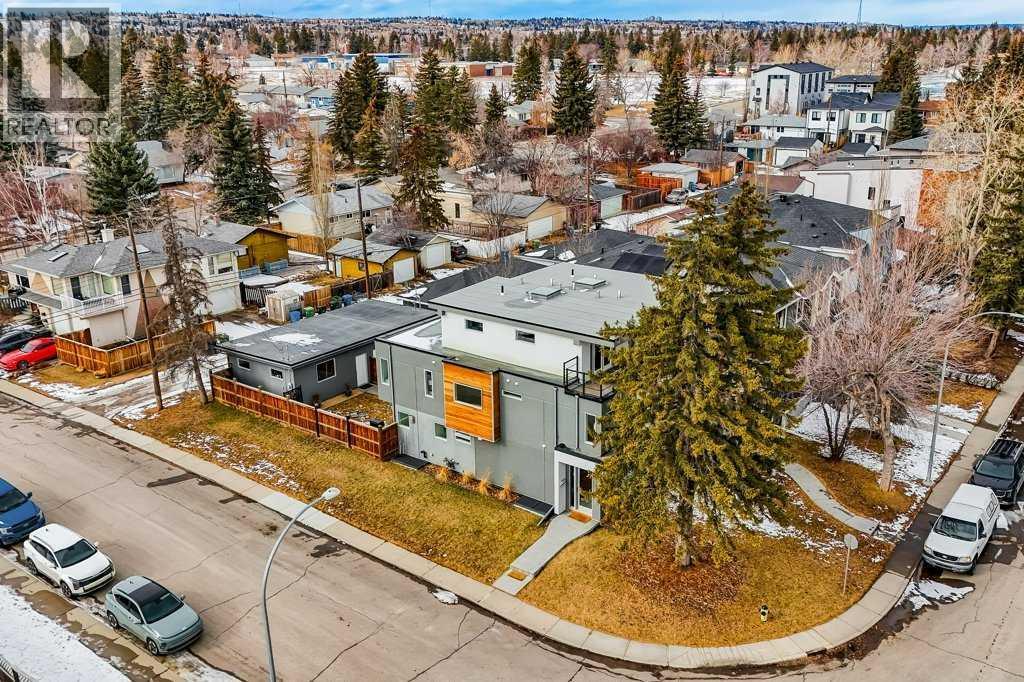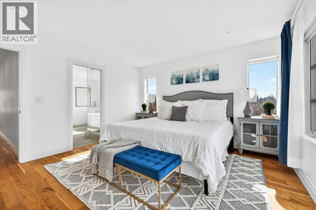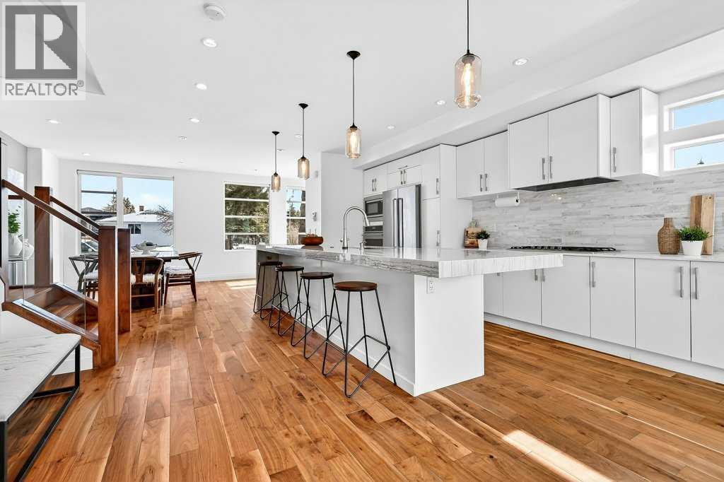 Welcome to this exceptional luxury infill in the desirable inner-city community of Glenbrook, offering over 3,000 sq ft of developed living space with 4 bedrooms and 5 bathrooms on a large corner lot with sunny south and west backyard exposure that fills the home with natural light throughout the day. The open-concept main floor is designed for both everyday living and entertaining. The stunning chef’s kitchen features high-end stainless steel appliances including a gas cooktop, extensive contemporary cabinetry, a marble backsplash, and a massive quartz island with waterfall edge and double-thick edge detail. The bright living room overlooks the backyard and is anchored by a sleek linear fireplace, creating a warm and inviting space. Walnut hardwood flooring runs throughout nearly the entire home, including the upper levels and basement living areas. The second floor offers three bedrooms, a full bathroom, convenient laundry, and mountain views. The spacious primary suite features a walk-in closet with built-ins and a spa-inspired ensuite with heated floors, double vanity, glass shower, and deep soaker tub beside a large window that fills the room with natural light. The entire third floor is a standout entertaining space, offering a bright and versatile lounge area complete with a wet bar, beverage fridge, and 2-piece bathroom. Step outside to the private balcony with gas hookup, perfect for relaxing or entertaining. The professionally developed basement includes a large recreation area with built-in wet bar, a fourth bedroom, and a full bathroom, along with in-floor slab heating for year-round comfort. Additional highlights include a double detached garage with 220V outlet for EV charging. Ideally located close to parks, schools, restaurants, and shopping at Westhills and Signal Hill Centre, with quick access to Richmond Road and Sarcee Trail and approximately an 8-minute commute to downtown Calgary. (id:6769