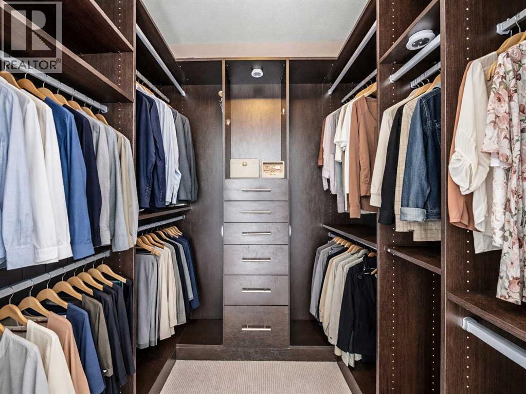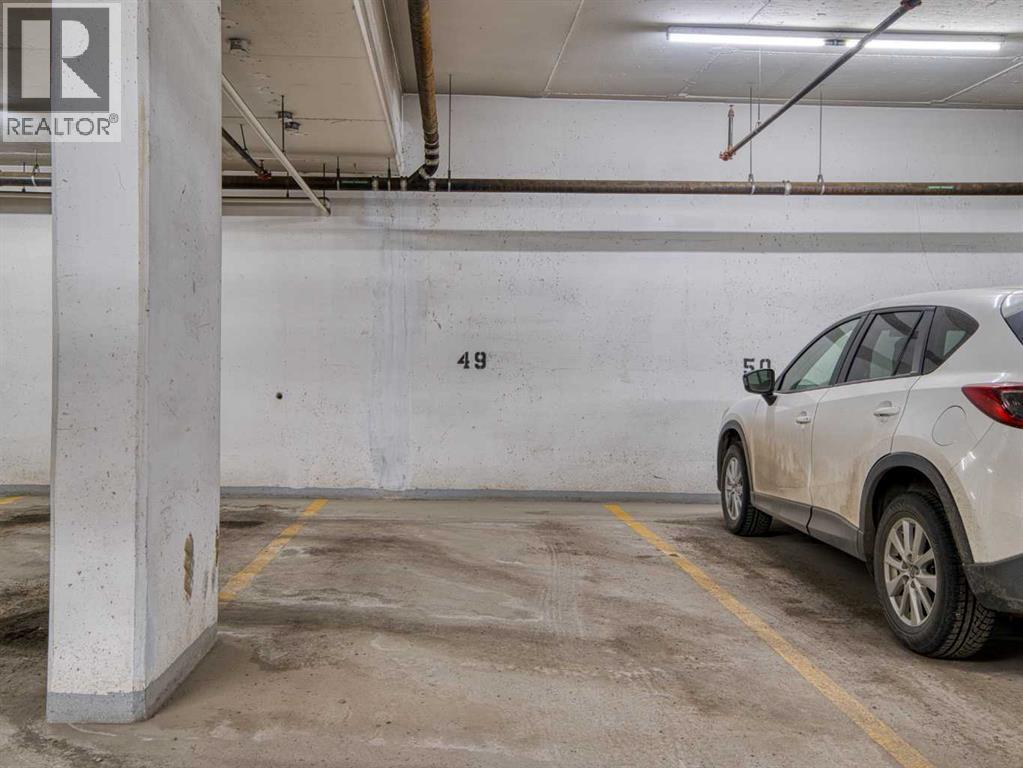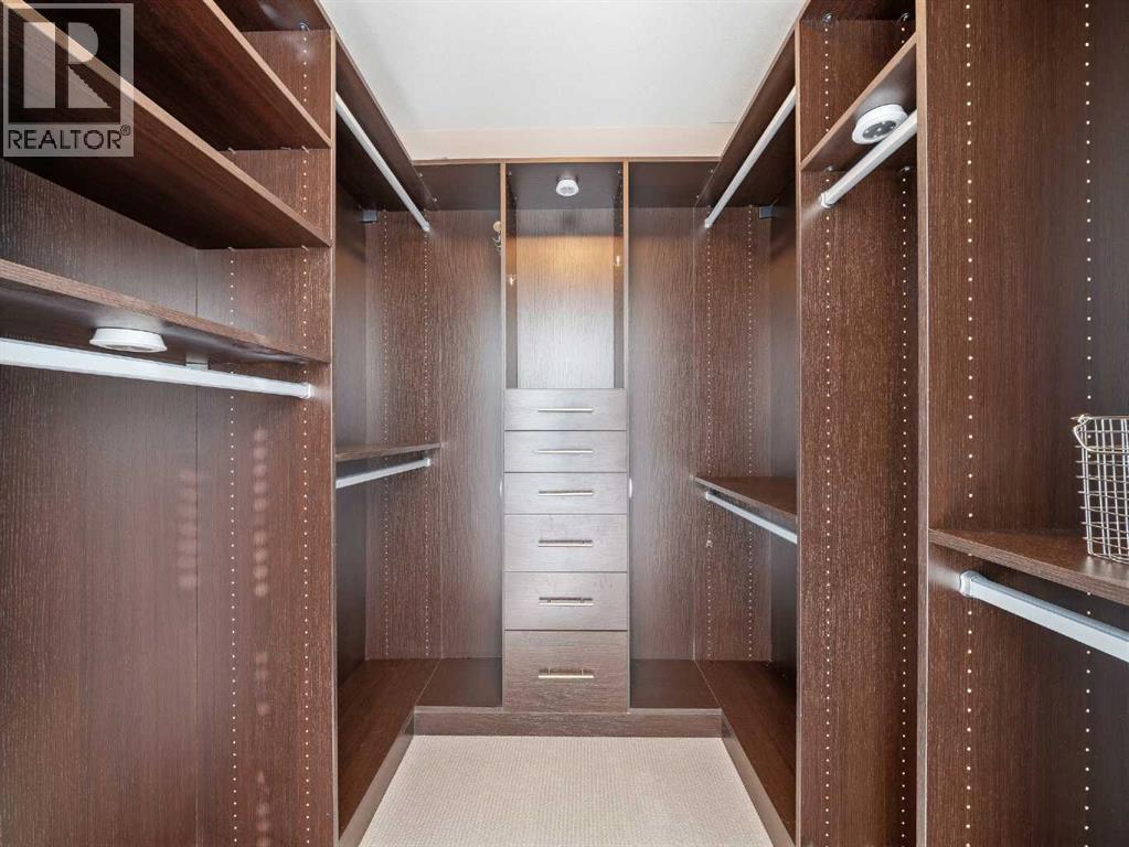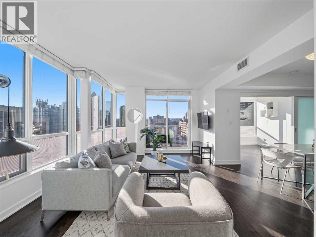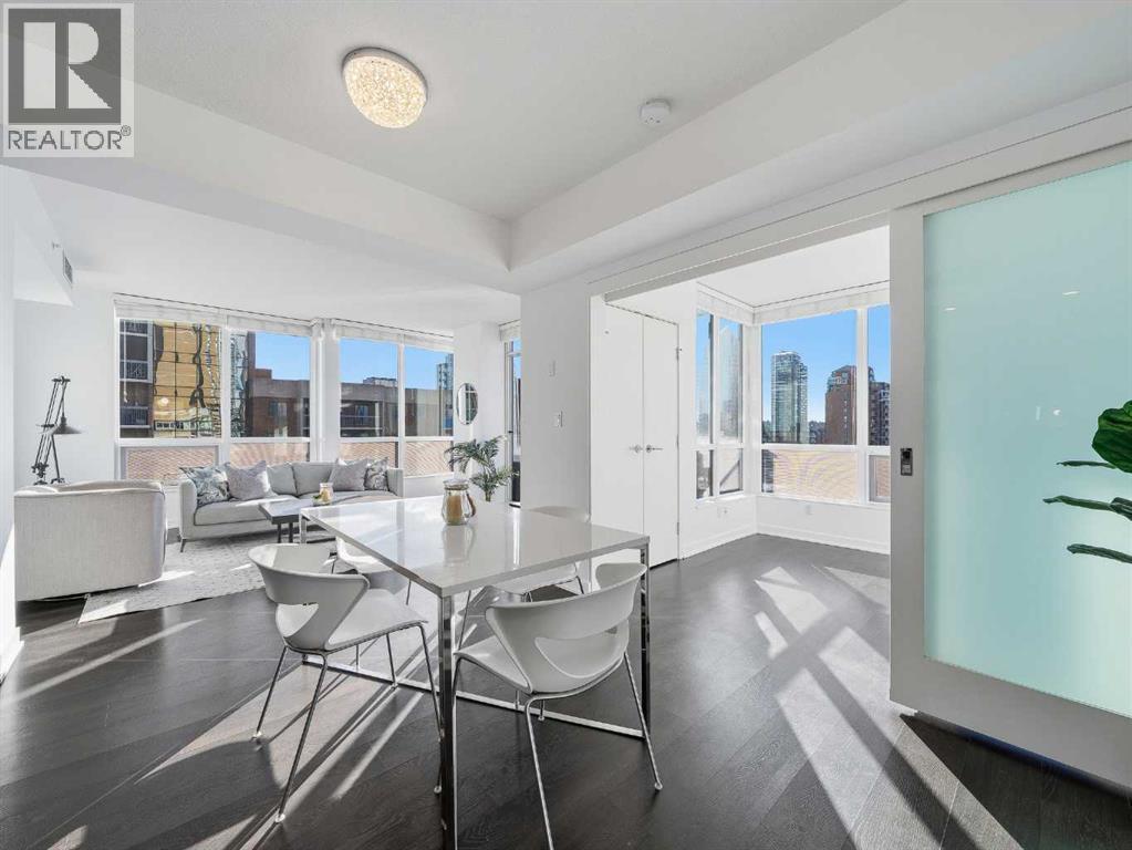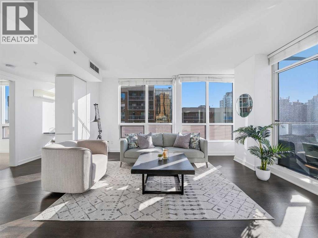 Rare opportunity to own a sub-penthouse apartment in the Calla, ideally located in Calgary’s Beltline. This southwest-facing corner unit offers over 960 sq. ft. of open-concept living space with city views and a clear outlook over the historic Lougheed House and its surrounding green space.Exceptionally quiet, this home shares only one adjoining wall in the ensuite. The unit above is set back, so most of the space has only a patio overhead.The kitchen features a large island seating four, stone countertops, stainless-steel appliances, and plenty of drawer storage. A separate pantry adds more space. The kitchen connects to a dining area and living room, with an additional office nook offering great natural light.The primary bedroom includes a custom walk-in closet plus an additional built-in for extra storage. The ensuite bathroom has dual sinks, a tiled shower, and a soaker tub. The second bathroom includes a tiled shower, stone countertop vanity, and the in-suite stacked washer and dryer.The second bedroom features floor-to-ceiling windows and can serve as a guest room or office. Flooring includes laminate throughout, carpet in the primary bedroom, and tile in both bathrooms.The balcony offers excellent city views and enough space for a patio set, with barbecues permitted. Additional features include in-unit storage near the entrance, a same-floor storage locker, and a titled heated underground parking stall. The building also provides heated visitor parking and bicycle storage, with convenient 2-hour street parking out front. Building amenities include a fitness centre, yoga studio, guest suite (available for $75/night), and concierge from Tuesday through Saturday for deliveries and added security and convenience. A well-designed, quiet, and spacious unit in one of downtown Calgary’s most desirable buildings. (id:6769