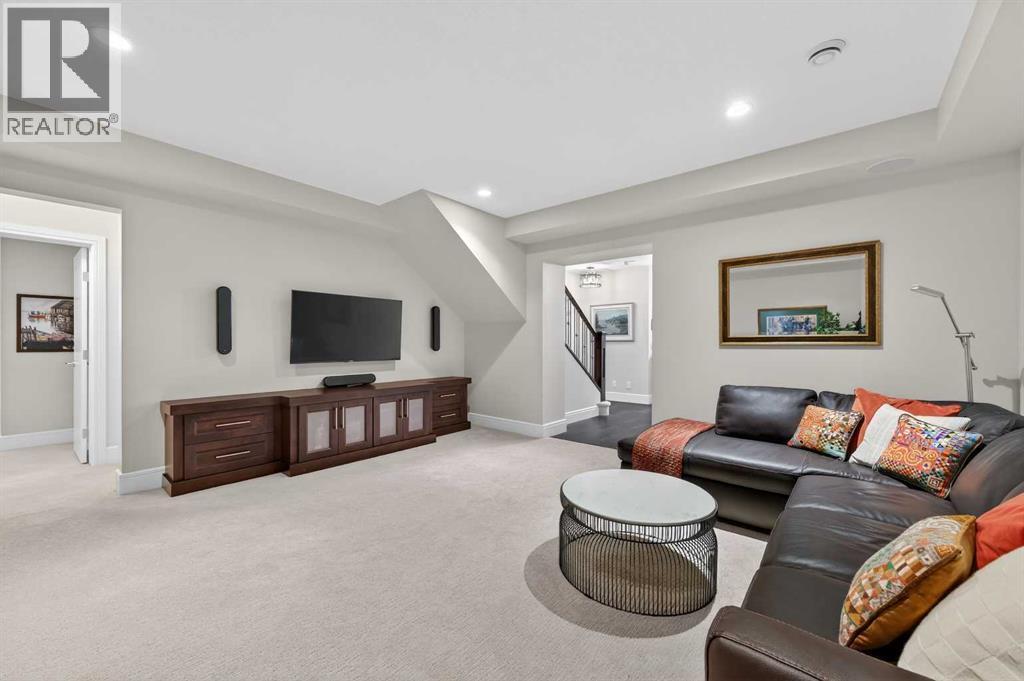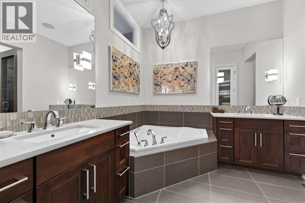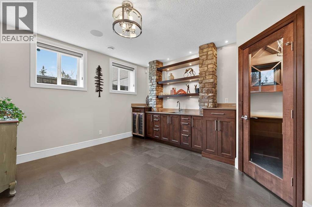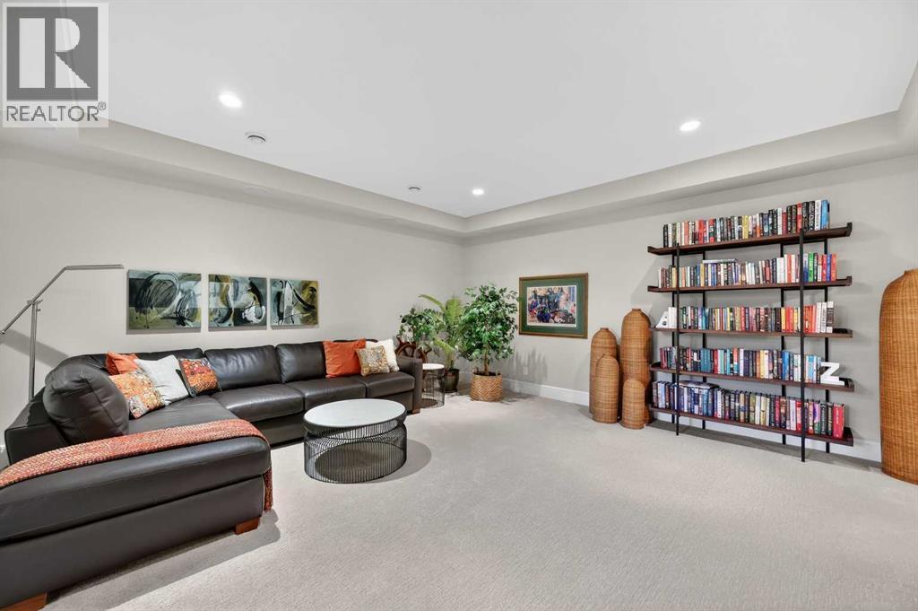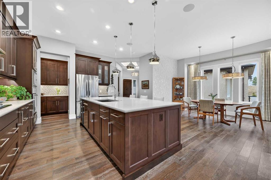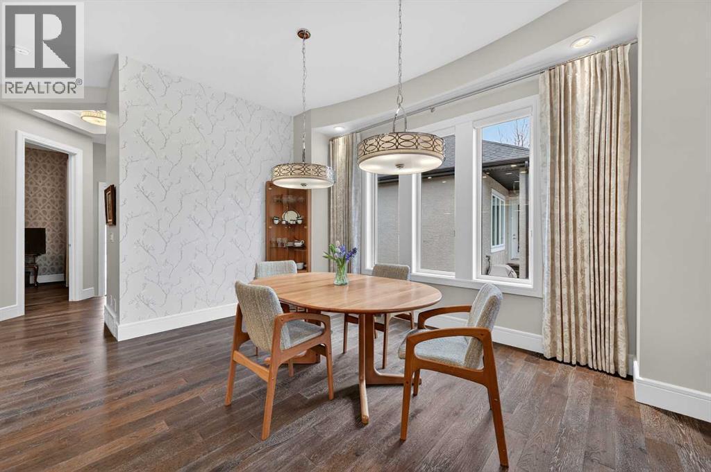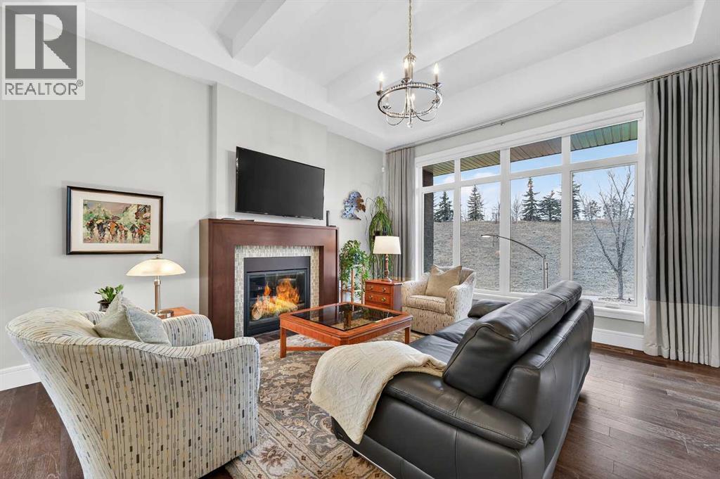 This villa, built by Calbridge Homes, was the original showhome for the complex and features a number of thoughtful upgrades and finishing touches throughout including designer lighting fixtures, Sonos multi-room sound system and a man door into the garage. Set within a quiet enclave of just 36 units, it offers a comfortable, low-maintenance lifestyle in a peaceful setting. The main floor features a bright, open-concept layout filled with natural light and views of green space and a west-facing patio. A warm and inviting living room showcases a gas fireplace, while a spacious dining area flows easily into the kitchen—ideal for everyday living and entertaining. The kitchen is well-appointed with a large island, extensive granite countertops, stainless steel appliances and a convenient butler’s pantry. A private front office or den provides a quiet place to work or relax. Custom drapes, shades, and designer wallpaper add a refined touch throughout. The primary suite is a calm retreat, complete with a 5-piece ensuite featuring dual sinks, a walk-in shower, soaker tub, in-floor heating, and a generous closet. A powder room and a conveniently located laundry room with access to the garage complete the main floor. A bar area just off the living room, with access to the patio, adds to the home’s functionality. The fully finished lower level offers an entertainment room with as surround sound home theatre with Tannoy speakers, a bar with stone accents plus a wine cellar, three additional bedrooms or flexible spaces, a four-piece bathroom, and a large storage area with room for a workshop. Don't miss this opportunity to embrace luxurious, maintenance-free living in one of the most sought-after villa communities in Heritage Pointe and only a five minute drive to all major amenities. (id:6769