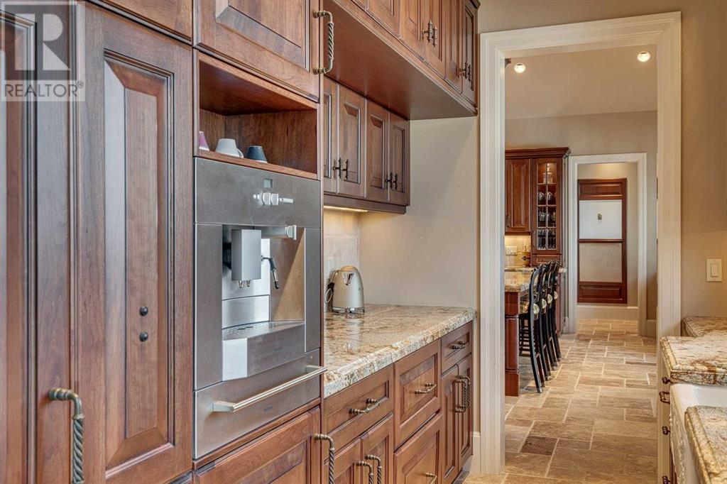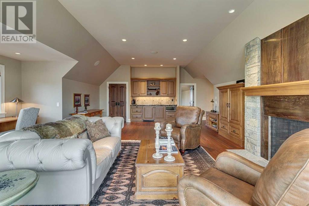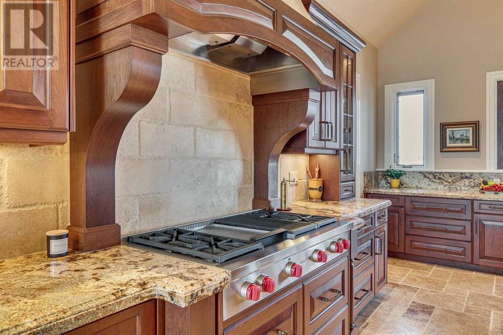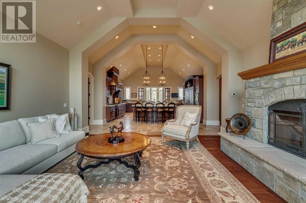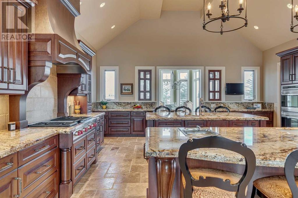 Nestled on 6.1 serene acres only 5 minutes to Calgary city limits, this exquisite French Country estate offers an unparalleled blend of luxury and elegance with a stunning mountain view. Culinary enthusiasts will love the chef-inspired kitchen, featuring two oversized islands and integrated built-in appliances. The home boasts a very large dining room, perfect for hosting grand gatherings, and a butler’s pantry with a dumbwaiter for seamless service. The expansive primary suite is a true retreat, featuring a cozy fireplace and separate his-and-hers en suites, both with steam showers and spacious walk-in closets. A charming upstairs loft includes its own spacious bedroom, family room, laundry and a spa-like bathroom. The walk-out basement is an entertainer’s dream, complete with a wet bar, gym, wine room, and additional butler’s pantry. Outdoors, unwind in a private oasis with a tranquil pond, cascading waterfall, and beautiful pergolas. A gated driveway and oversized quadruple garage complete this remarkable property, offering privacy and sophistication at every turn. (id:6769